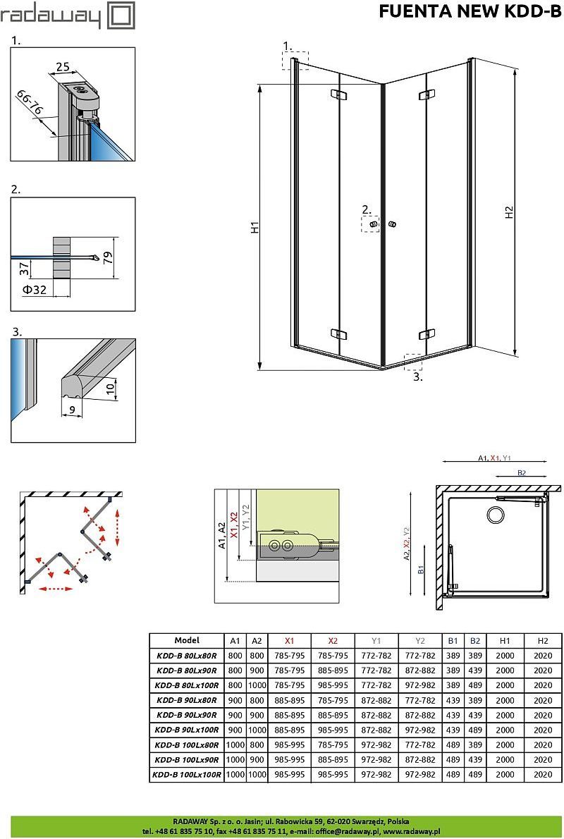 Душевое ограждение Radaway Fuenta New KDD-B 900х800х2000 мм. Размеры с диапазоном регулировок: (885-895)x(785-795) мм. Профиль - хром, стекло - прозрачное, 6 мм. Поддон приобретается отдельно.