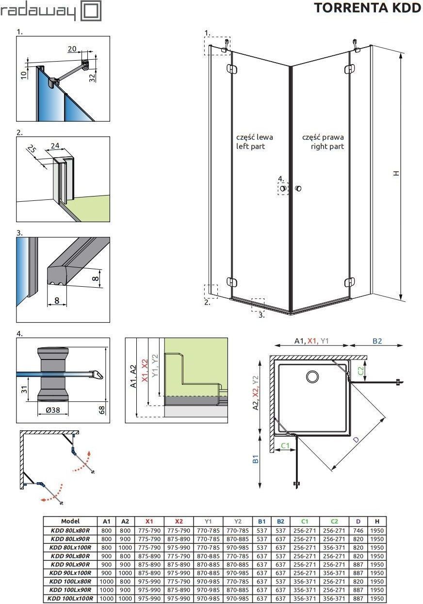 Душевое ограждение Radaway Torrenta KDD 900х800х1950 мм. Профиль - хром, стекло - прозрачное, 6 мм. Размеры с диапазоном регулировок: (875-890)x(775-790) мм. Ширина входа: 820 мм. Поддон приобретается отдельно.