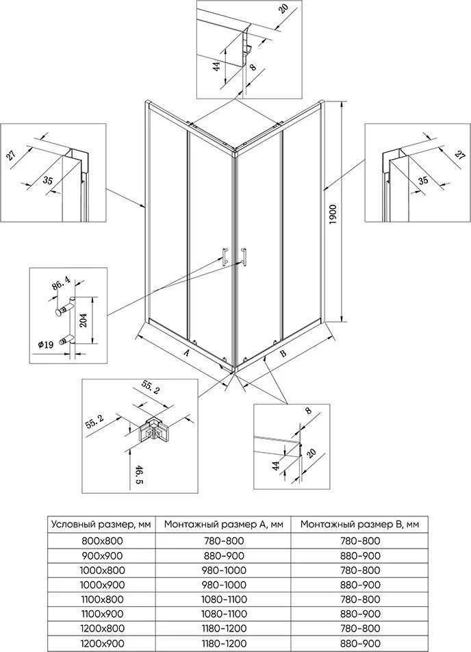 Душевое ограждение Veconi Rovigo 900x900x1900 мм, профиль черный матовый, стекло тонированное 5 мм, ширина входа 505 мм. Габариты регулировки (880-900)х(880-900)х1900 мм.