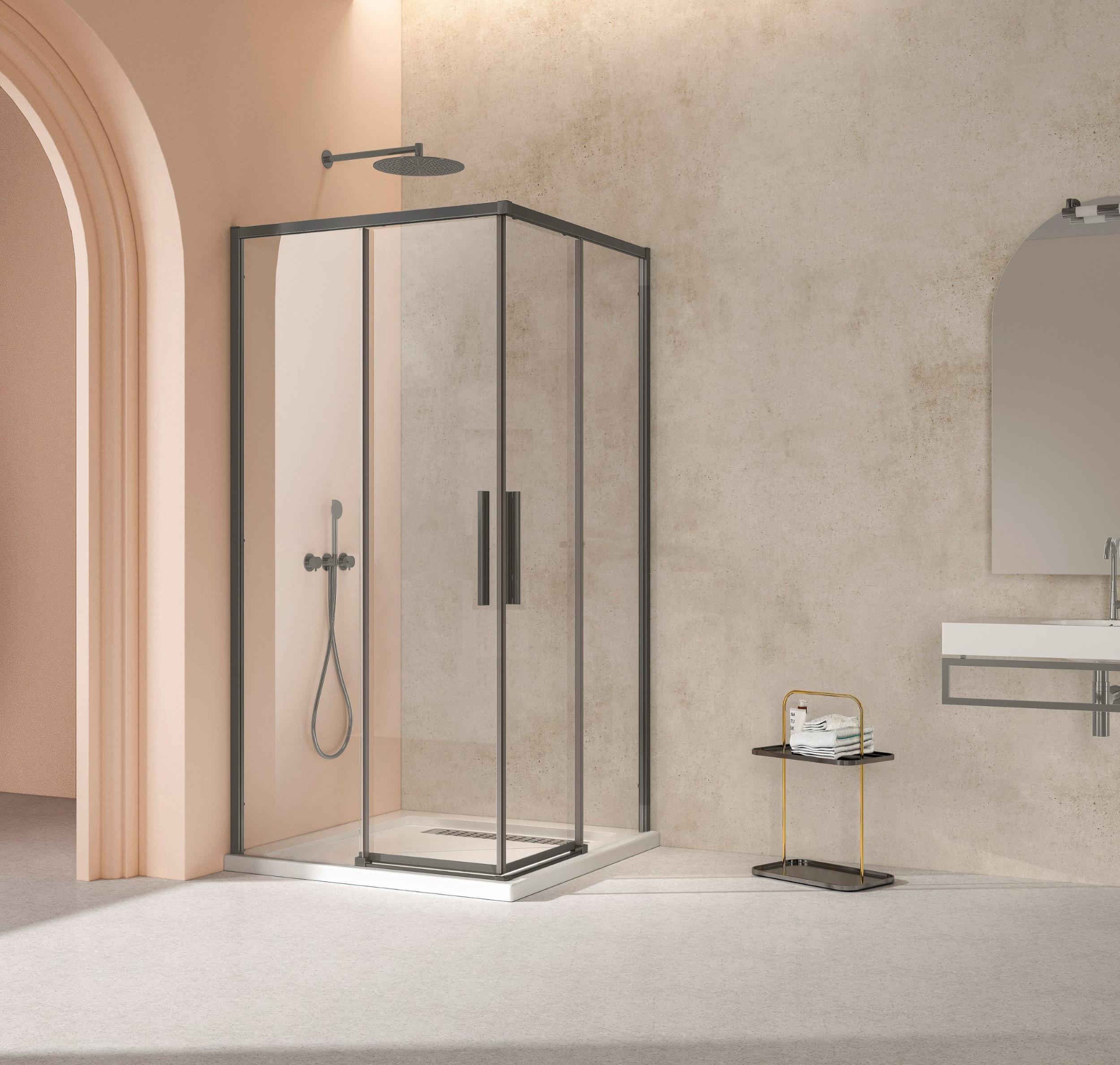 Душевое ограждение Vincea Slim VSS-4SL900CLGM, размер 900х900х1950 мм, профиль - вороненая сталь, стекло - прозрачное 8 мм с покрытием Easy Clean, ширина входа - 438 мм, габариты с диапазоном регулировок: 885-900 x 885-900 мм. Поддон приобретается отдельно.