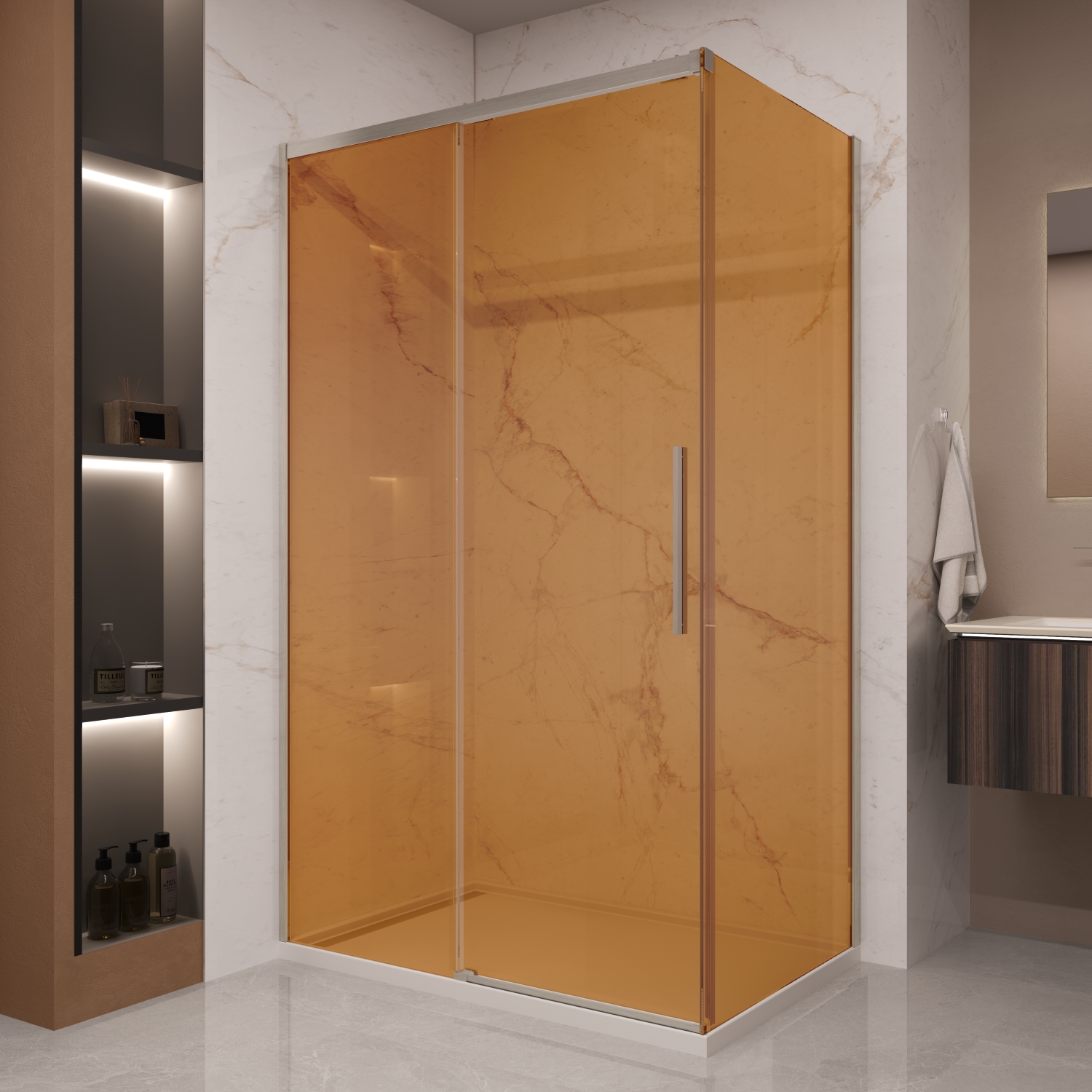 Душевое ограждение Vincea Stella VSR-1ST9012GSBN, размер 1200x900x2000 мм, профиль брашированный никель, стекло янтарь 8 мм с покрытием Easy Clean, доводчики закрывания двери, ручка 430мм, ширина входа 495-505 мм, габариты регулировки (1195-1215)x(880-900)x2000 мм. Дверь 120 см, душевая стенка 90 см. Поддон приобретается отдельно.