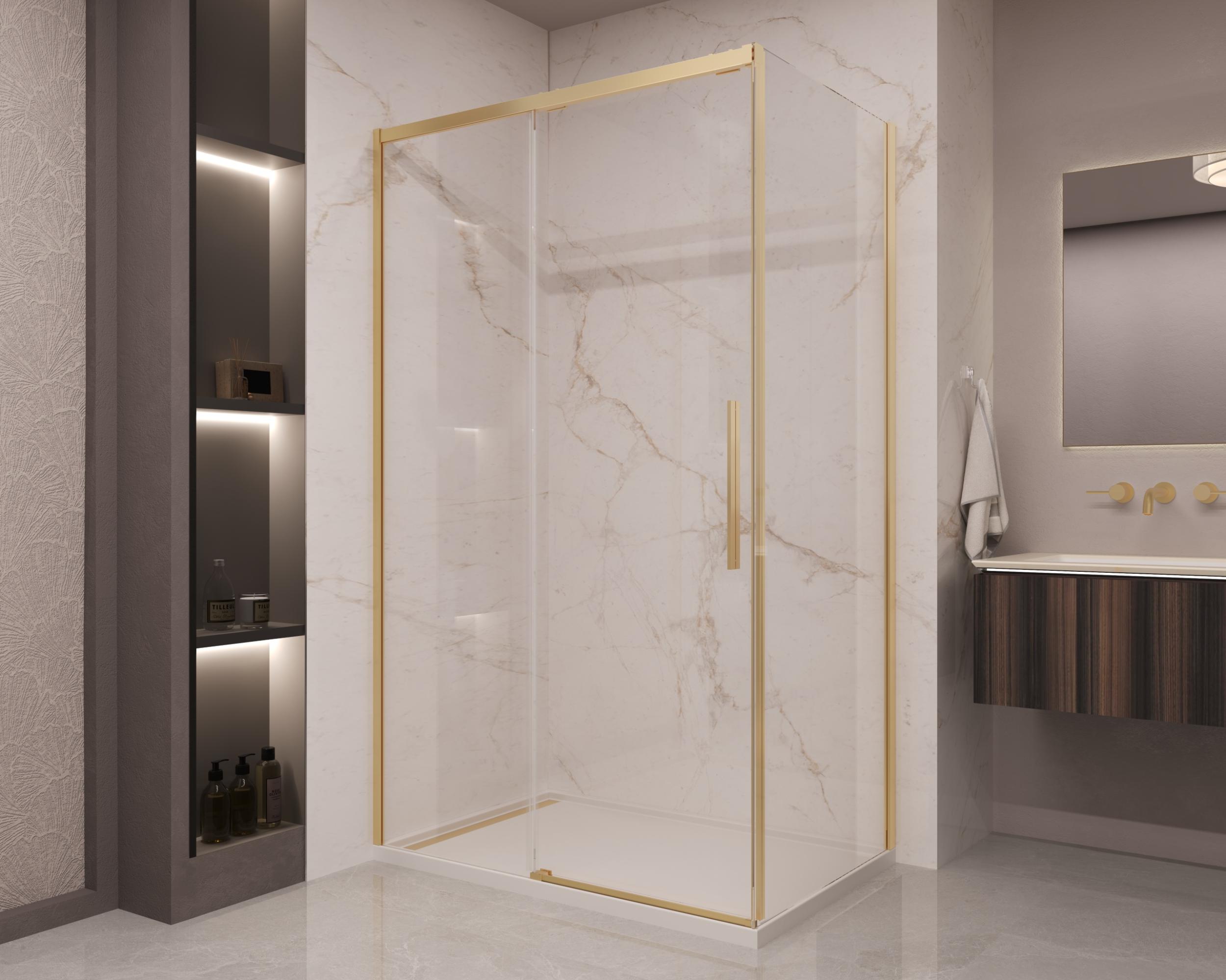 Душевое ограждение Vincea Stella VSR-1ST9015CLG, размер 1500x900x2000 мм, профиль брашированное золото, стекло прозрачное 8 мм с покрытием Easy Clean, доводчики закрывания двери, ручка 430мм, ширина входа 645-655 мм, габариты регулировки (1495-1515)x(880-900)x2000 мм. Дверь 150 см, душевая стенка 90 см. Поддон приобретается отдельно.