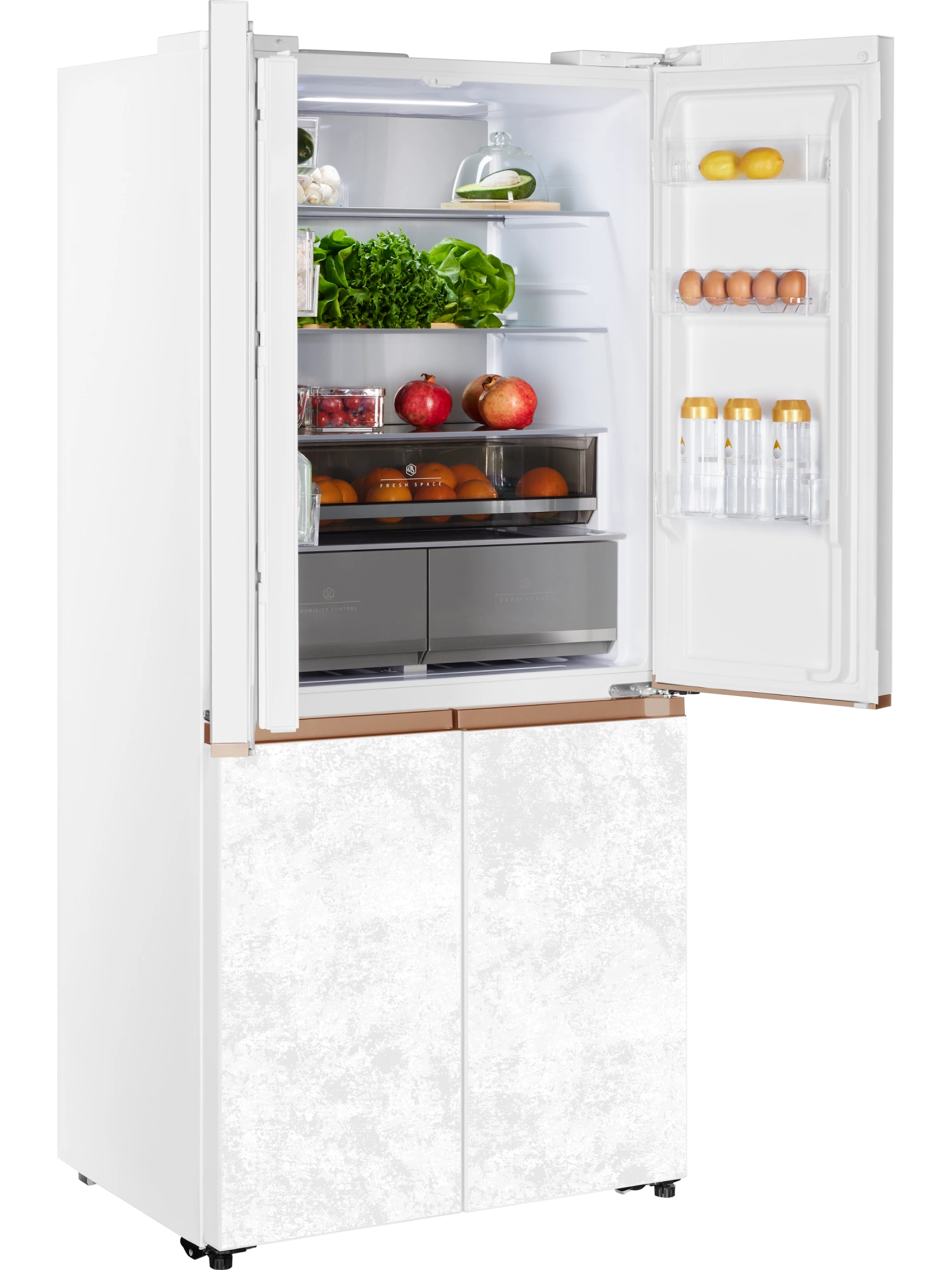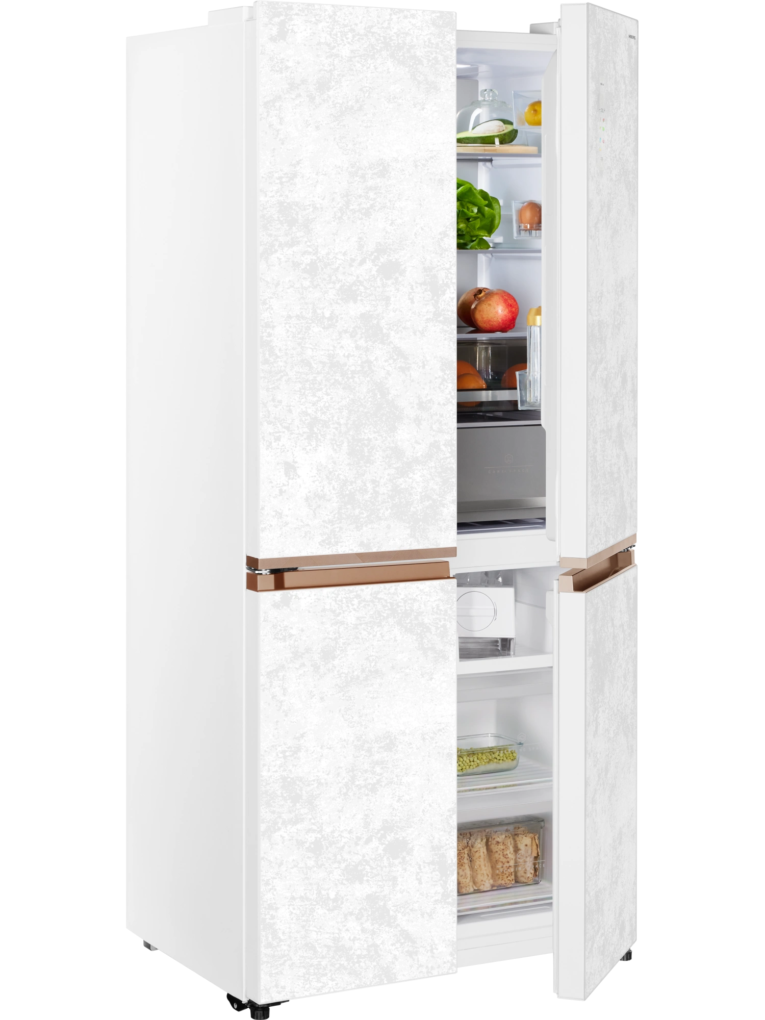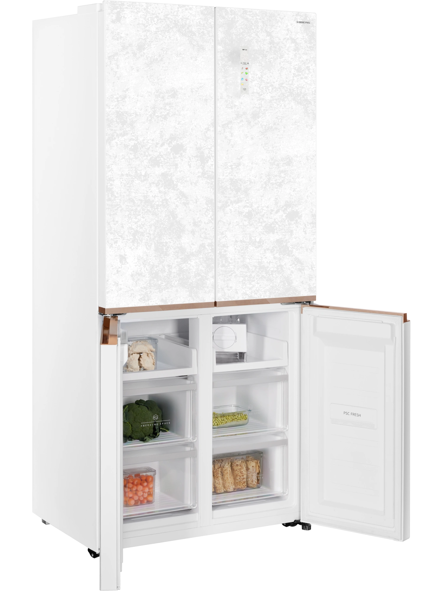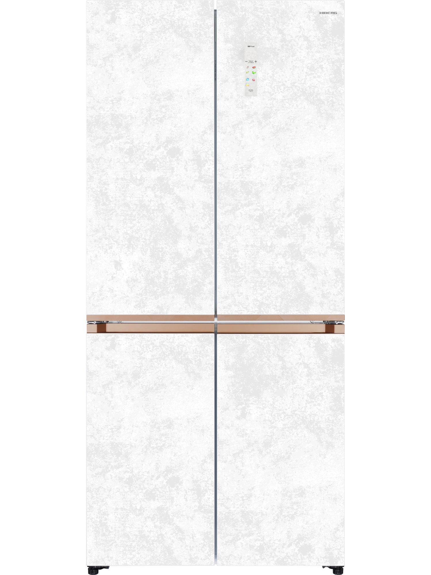- Четырехдверный инверторный холодильник HIBERG i-RFQ 630G WS – изысканный представитель бренда. Эффектный фасад из закаленного стекла в белом цвете с эффектом мрамора станет украшением любого кухонного и столового интерьера.
