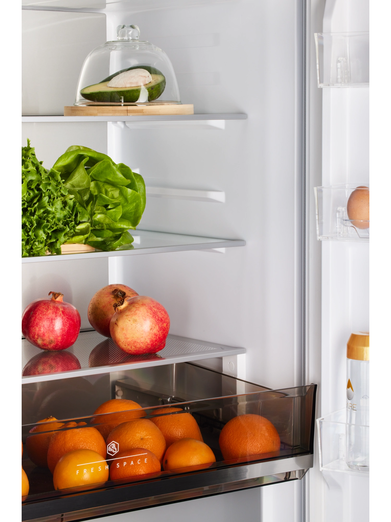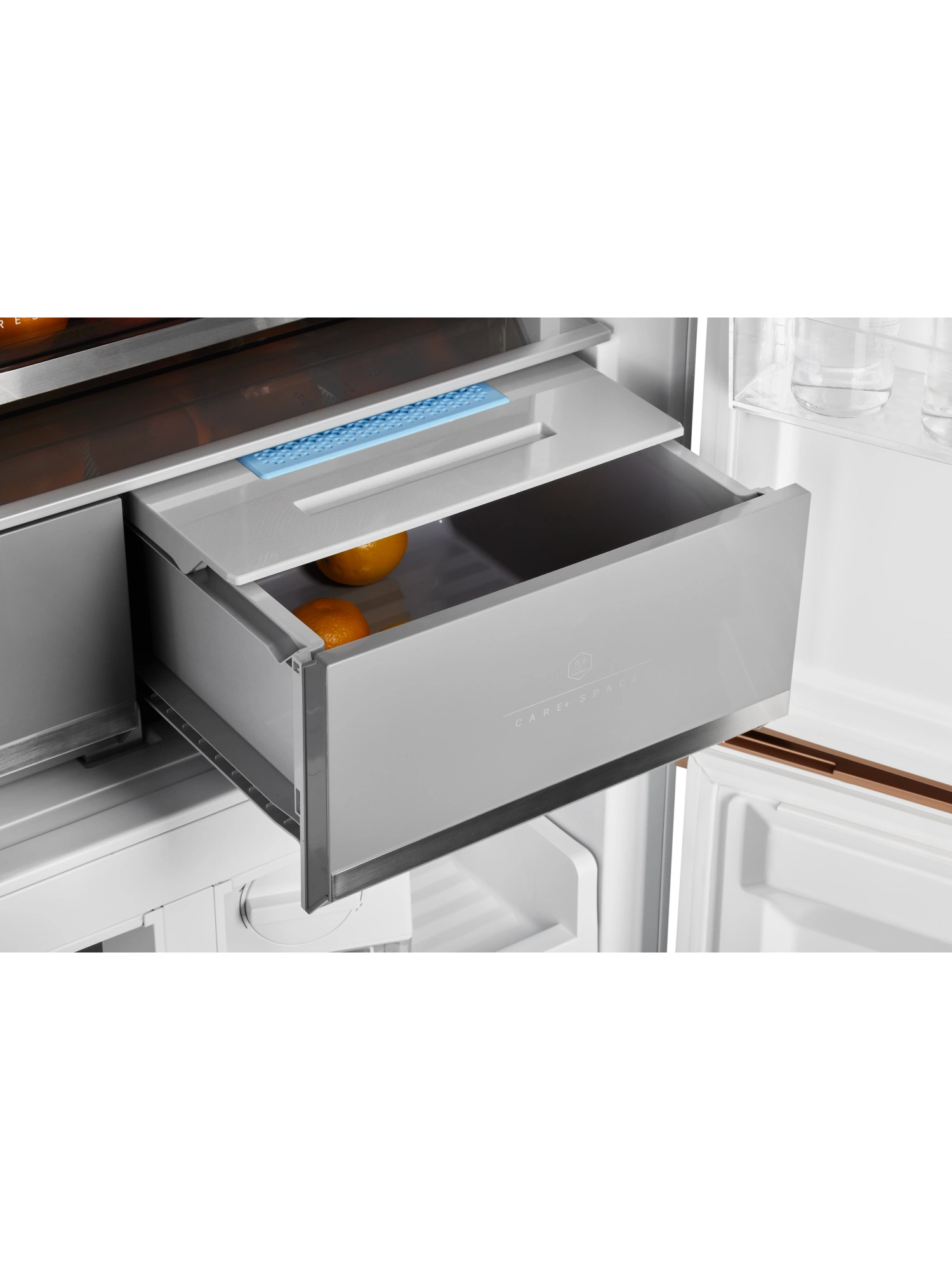 - Ящик CARE+SPACE с индивидуальной зоной охлаждения предназначен для хранения продуктов в нескольких режимах: «морепродукты» при температуре -1,5°С, «мясо» с показателем 2°С и «детское питание, фрукты» с температурой 4°С. Установленная в ящике мембрана поддерживает нужный для каждого из режимов уровень влажности. Выдвижное отделение для овощей и фруктов также оборудовано мембраной для удержания влаги внутри зоны, при этом не препятствует движению воздуха. Выдвижные крышки обоих ящиков обеспечивают дополнительную герметичность емкостей.