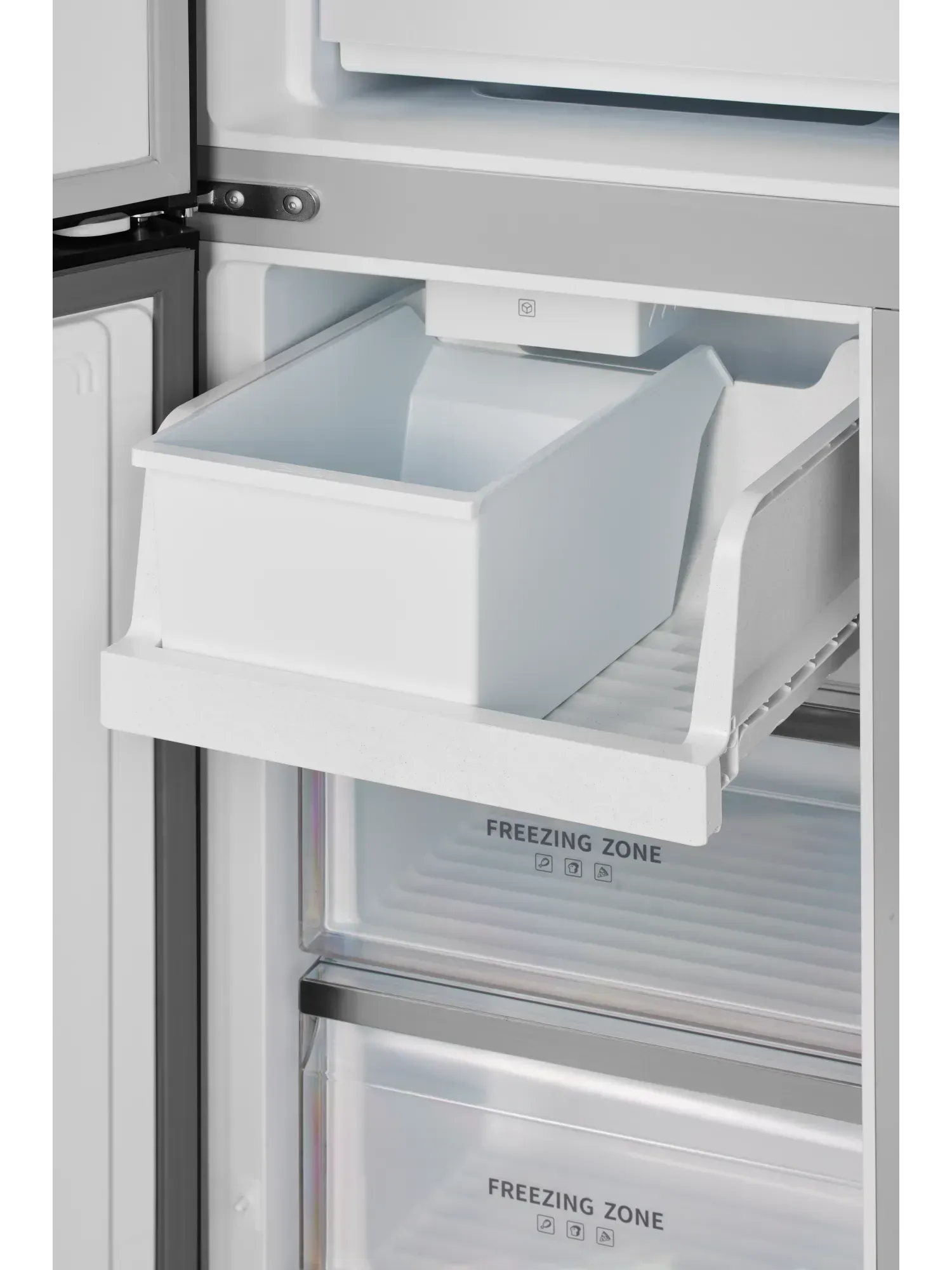- В структуру морозильной камеры интегрирован автоматический ледогенератор, не требующий подключения к водопроводу. Вода заливается вручную во встроенный резервуар объемом 1,6 литра — и вы всегда получаете свежий лед в любое время. Готовый лед автоматически поступает в контейнер для сбора (лопатка в комплекте).