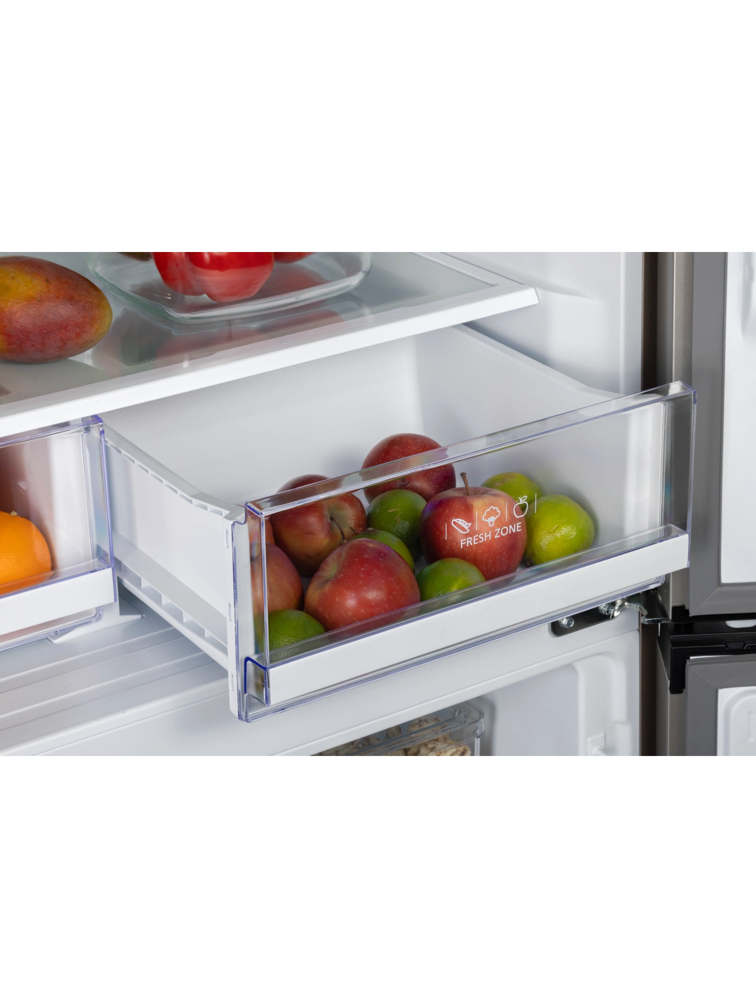 - Холодильное отделение с единым пространством удобно для хранения продуктов в габаритной посуде. Расположение стеклянных полок можно отрегулировать под высоту кастрюль и контейнеров. Нижние ящики для овощей и фруктов сохранят их свежесть и привлекательный вид, не утратив полезных свойств. Левый ящик с внутренней мембраной отлично справится с длительным хранением зелени благодаря повышенному уровню влажности.