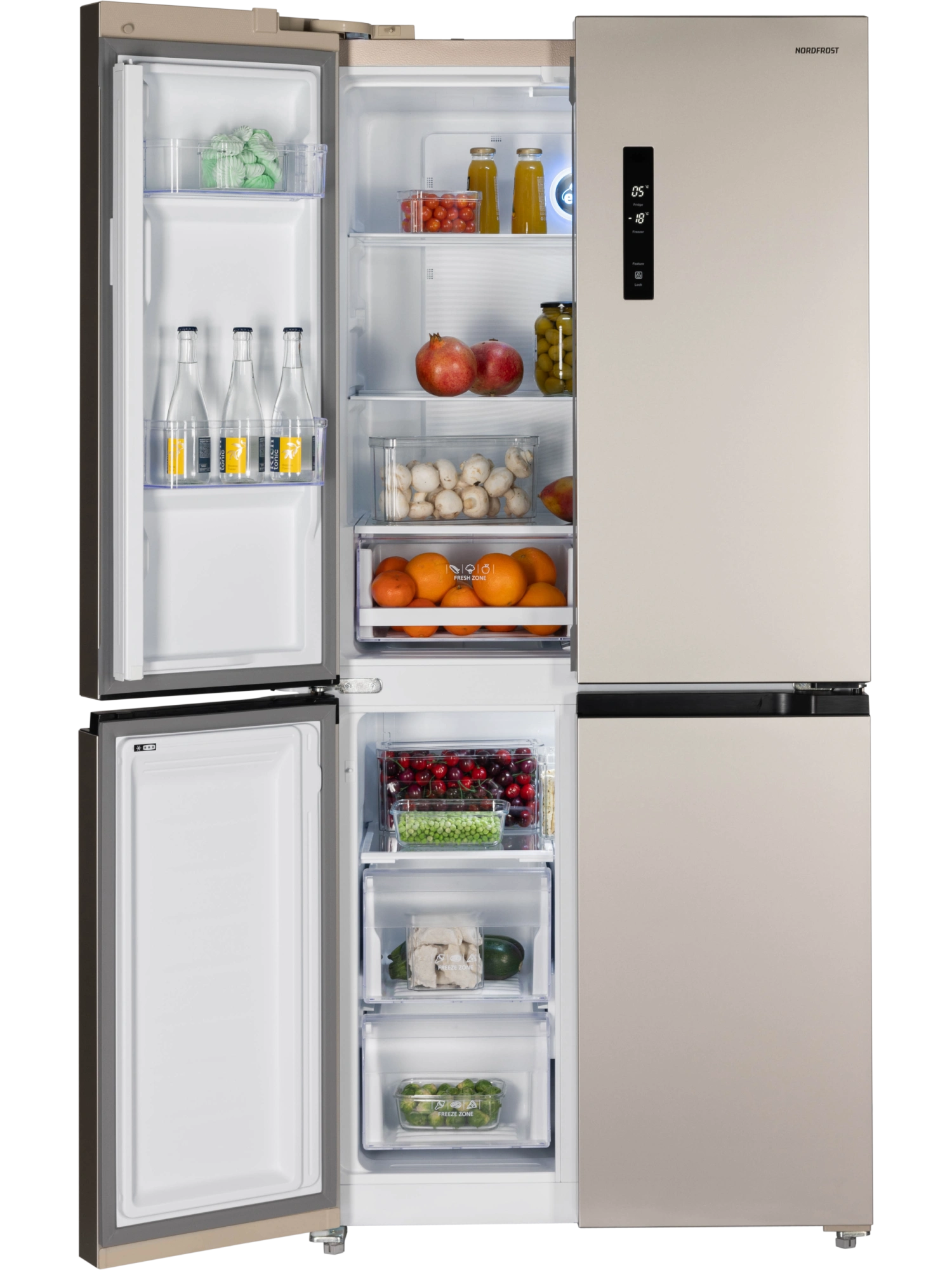 - Отдельностоящий четырехдверный холодильник NORDFROST RFQ 500 NFH выгодно отличается стильным исполнением и большим объемом 482 литра. Вместительный представитель бренда справится с хранением запаса продуктов для большой семьи. Элегантный современный дизайн и незаурядное цветовое решение оттенка шампань позволят холодильнику занять достойное место в кухонном интерьере квартиры и в столовой зоне загородного дома.