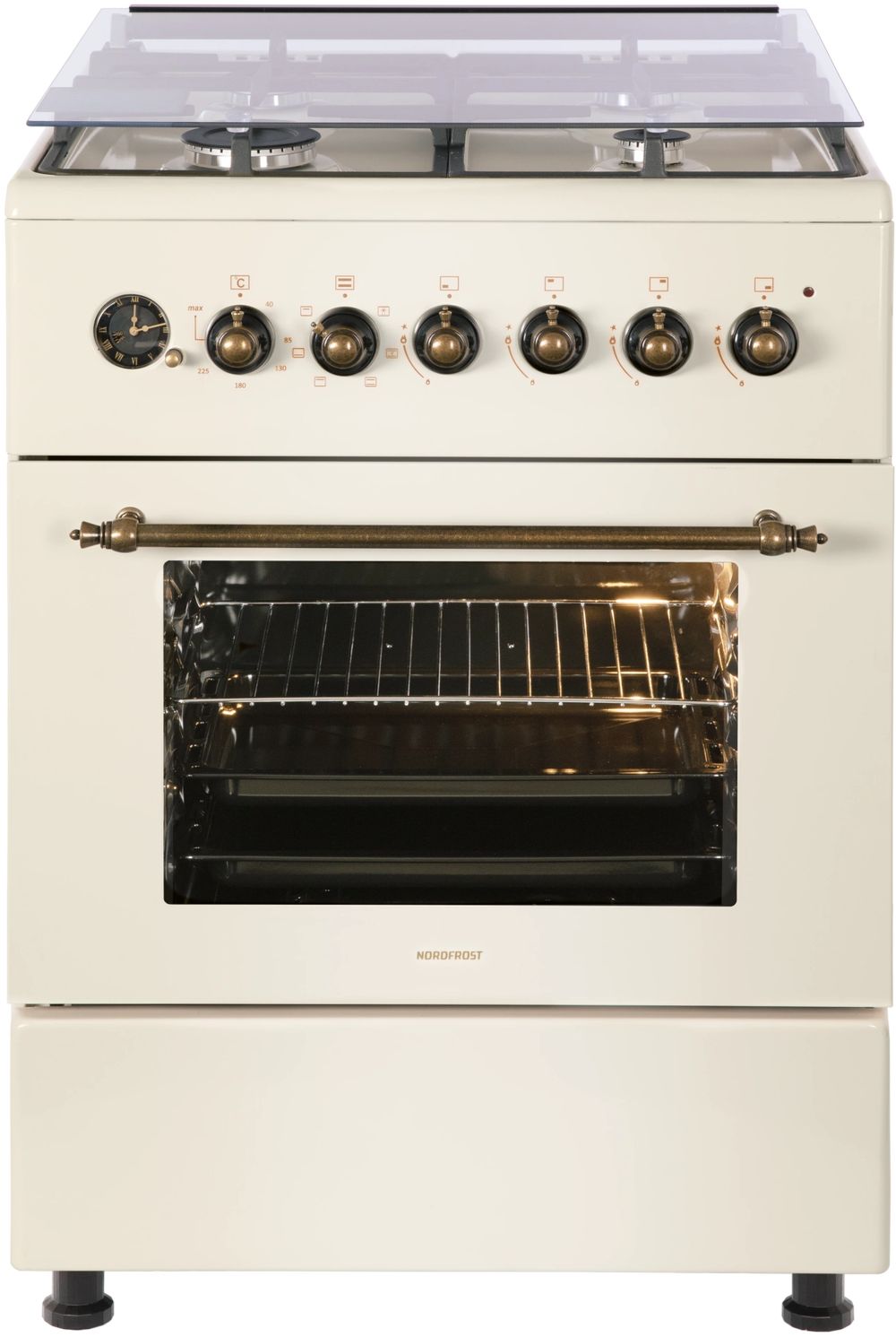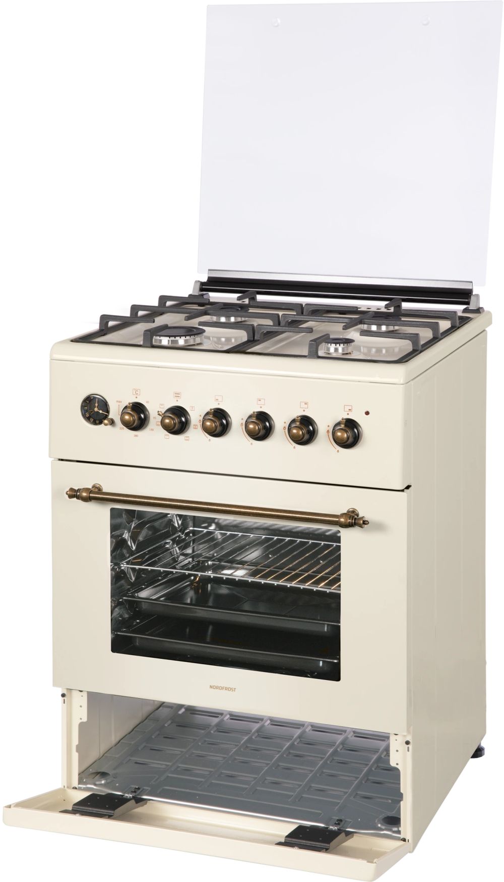 Выполненная в ретро стиле газоэлектрическая плита NORDFROST GE 6064 YR с объемом духовки 63 литра имеет функцию авторозжига и газ-контроль конфорок.