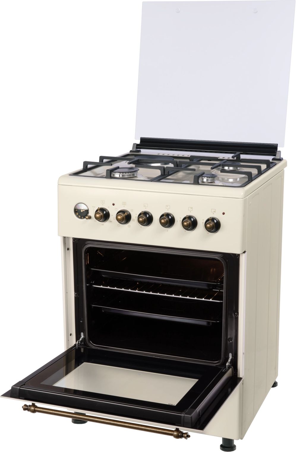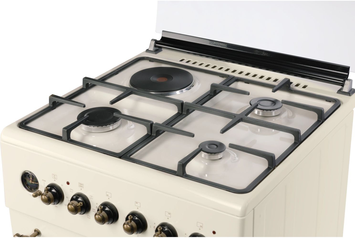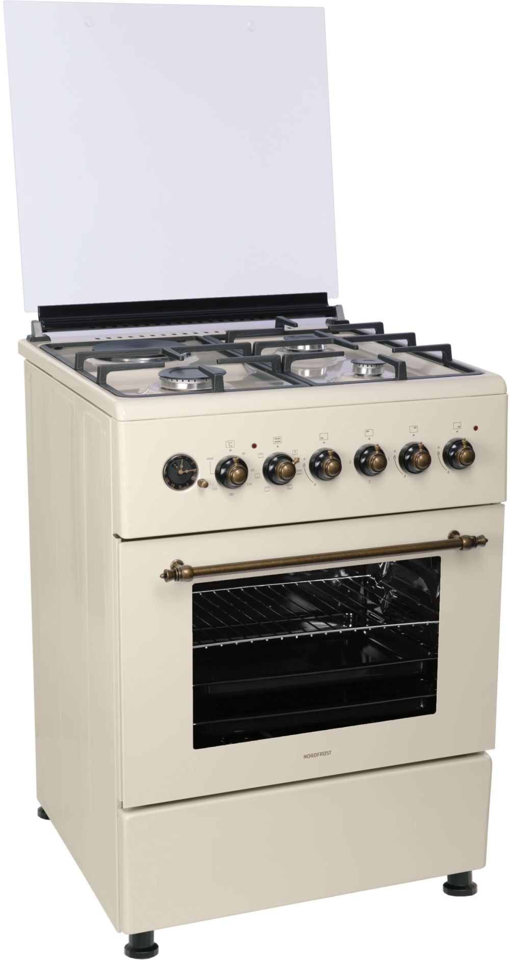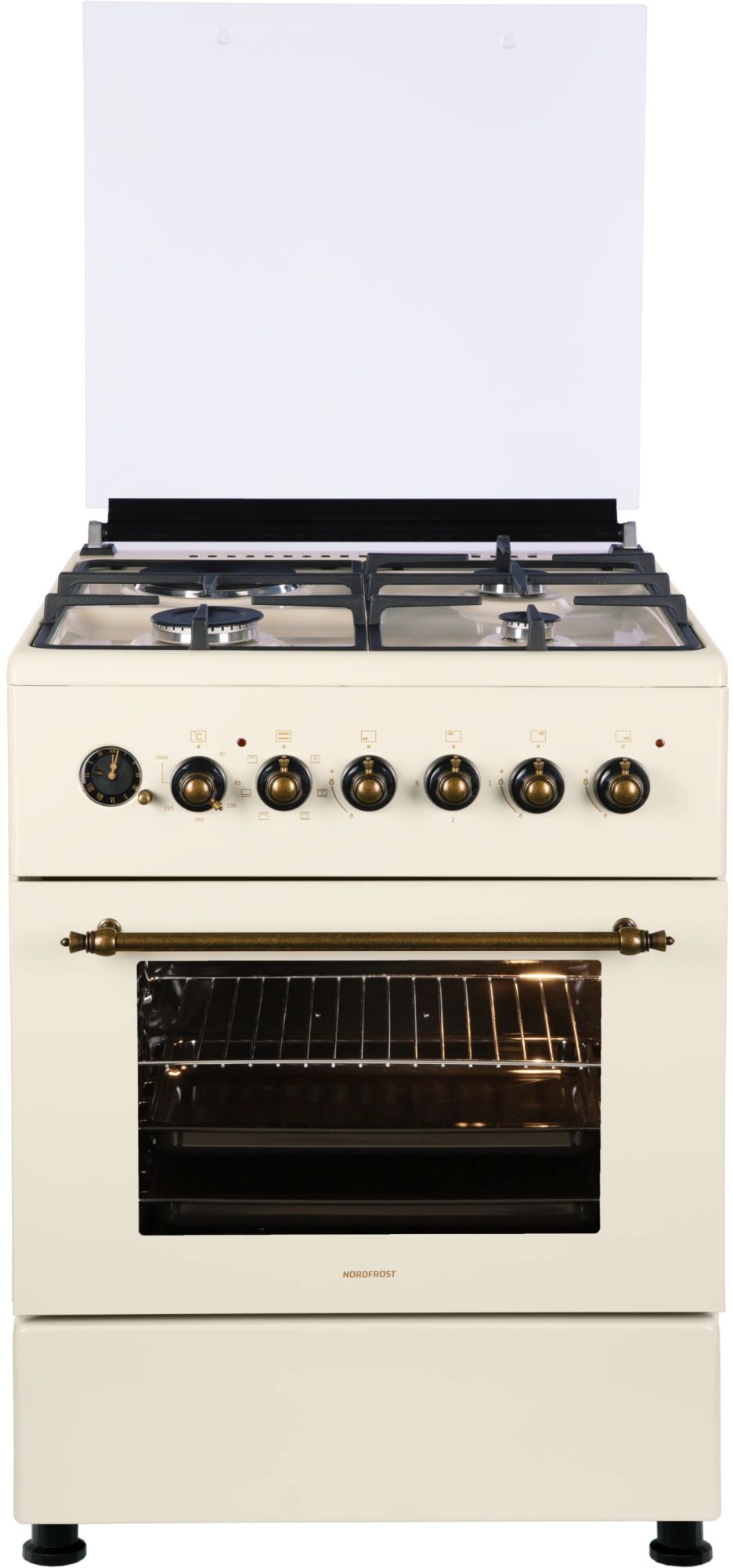 Выполненная в ретро стиле газоэлектрическая плита NORDFROST GE 6162 YR имеет объем духовки 63 литра, оснащена одной электрической экспресс-конфоркой и тремя газовыми конфорками с функцией авторозжига.