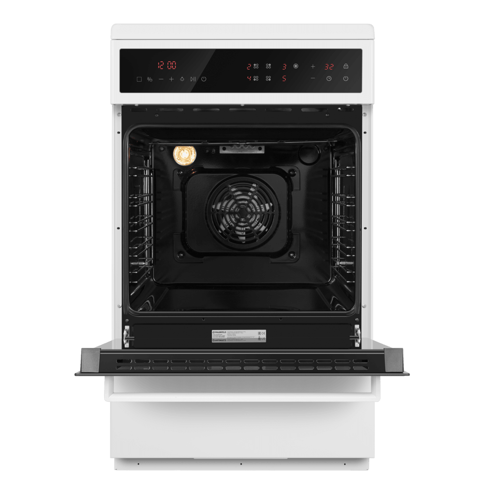 Полноразмерная электрическая плита с сенсорным управлением, варочная поверхность - стеклокерамическая. Техническое оснащение также на уровне - конфорки рабочего стола и духовой шкаф управляются сенсорами, в комплектацию входит многофункциональный таймер. Духовой шкаф оснащен конвекцией и грилем. Благодаря яркому внутреннему освещению виден весь объем духовки, нет необходимости открывать дверцу для контроля готовности блюда. Комфортная в эксплуатации, для удобства ухода за плитой, направляющие для противней - съемные и легко чистятся. Предусмотрен и ящик для хранения кухонной посуды. Модель по праву заслуживает место на Вашей кухне.