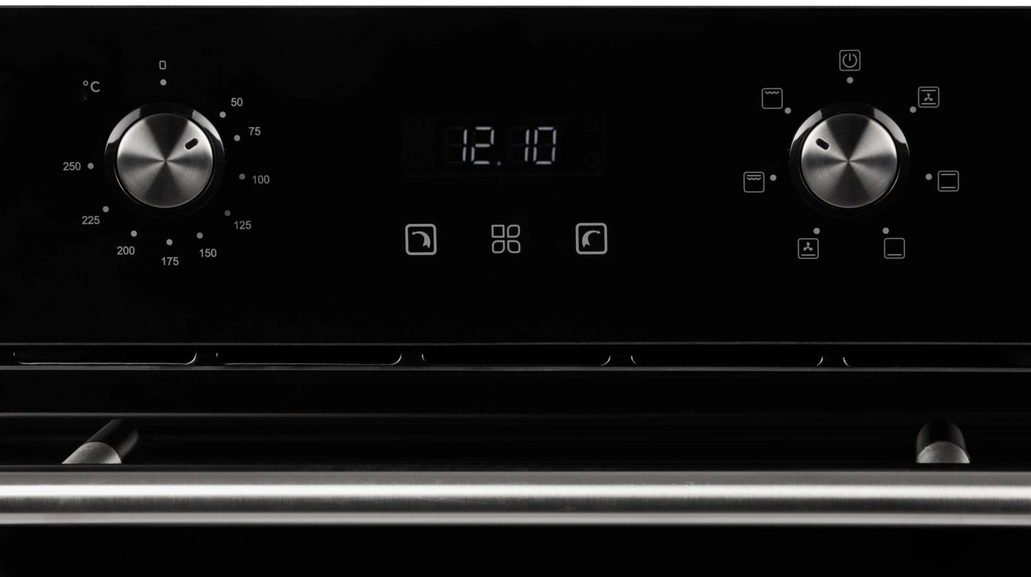 • Выбор программы и настройка температуры осуществляется с помощью поворотных регуляторов, расположенных на фронтальной части корпуса. Ручка дверцы духовки и регуляторы выполнены из металла.