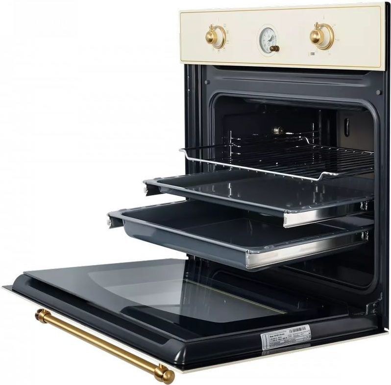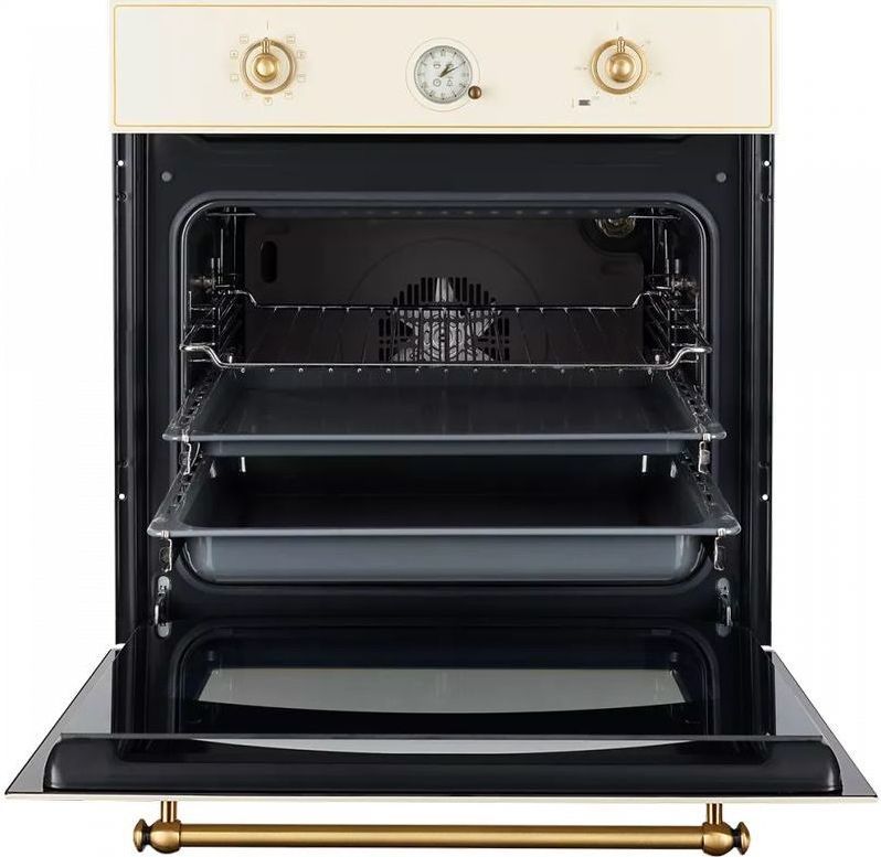 Духовой шкаф SR 609 C Bronze, оснащенный доводчиком дверцы, двухуровневыми телескопическими направляющими для противней и поворотными переключателями, помимо прочего, демонстрирует высокую производительность.