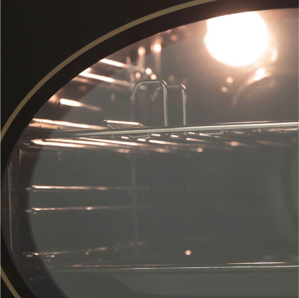 - Фронтальная панель дверцы сделана из высококачественного жаропрочного стекла черного цвета. Цельнометаллическая фурнитура цвета "Бронза" идеально дополняет общий образ. Внутреннее покрытие камеры выполнено из специальной легкоочищающейся эмали черного цвета.