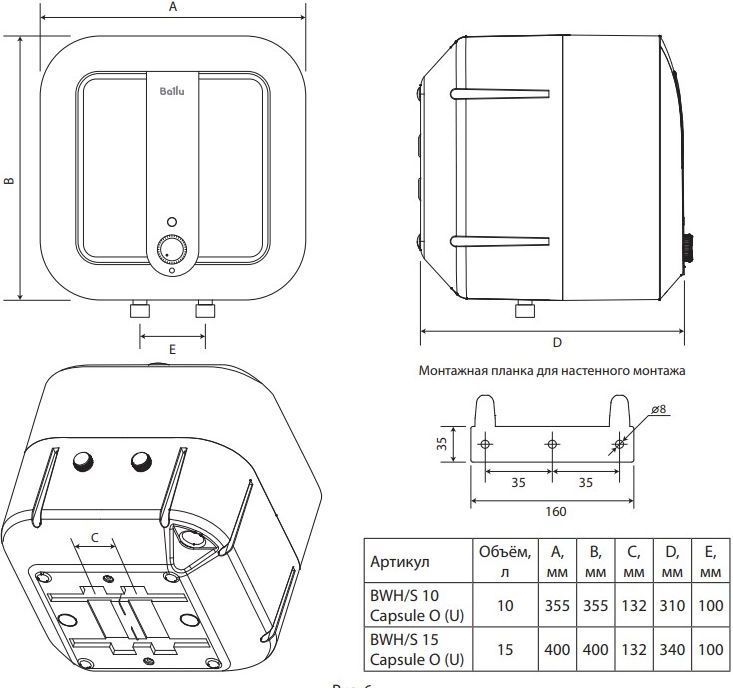 Электрический водонагреватель Ballu Capsule O BWH/S 10 (на 10 л. над мойкой)