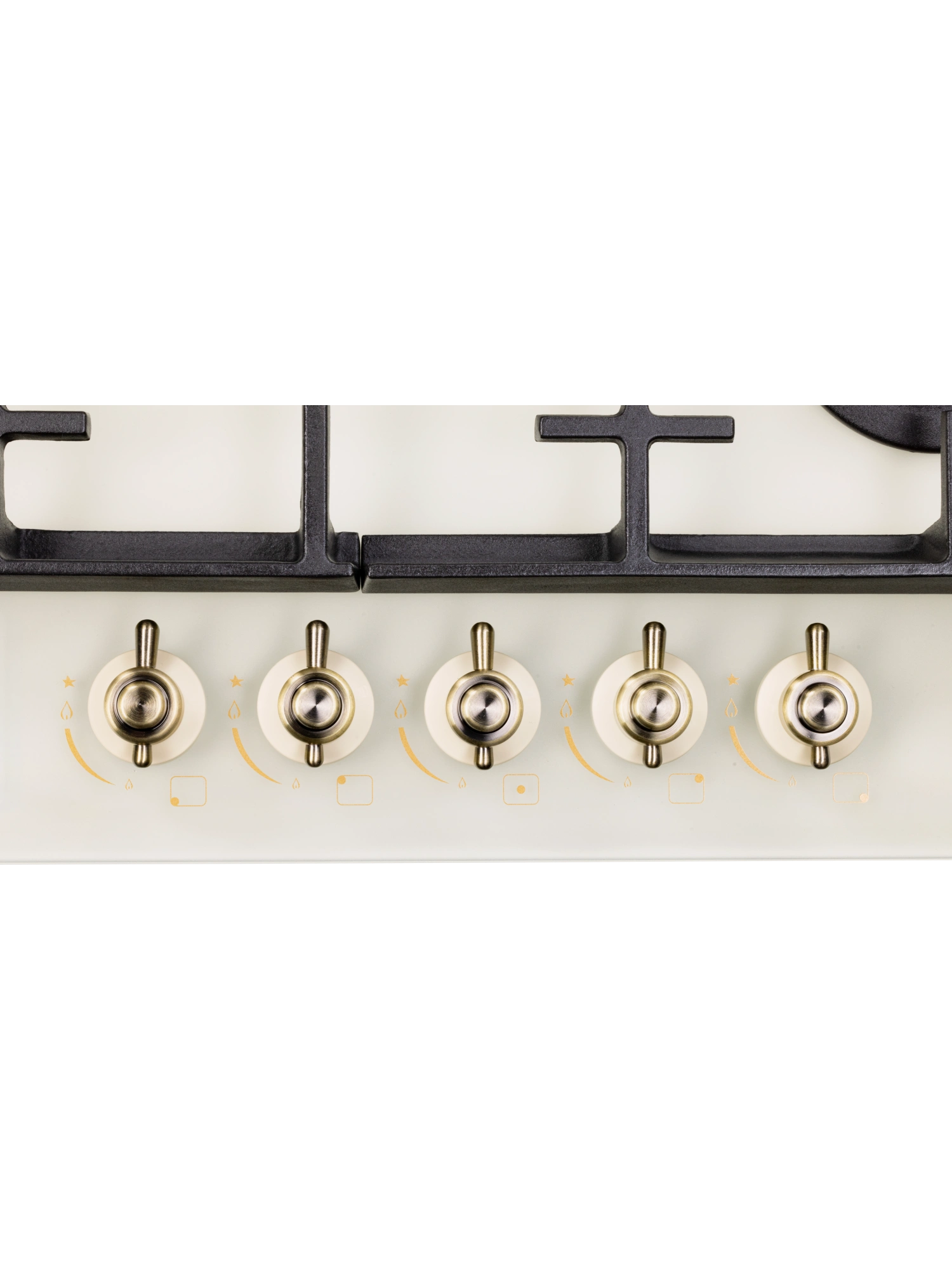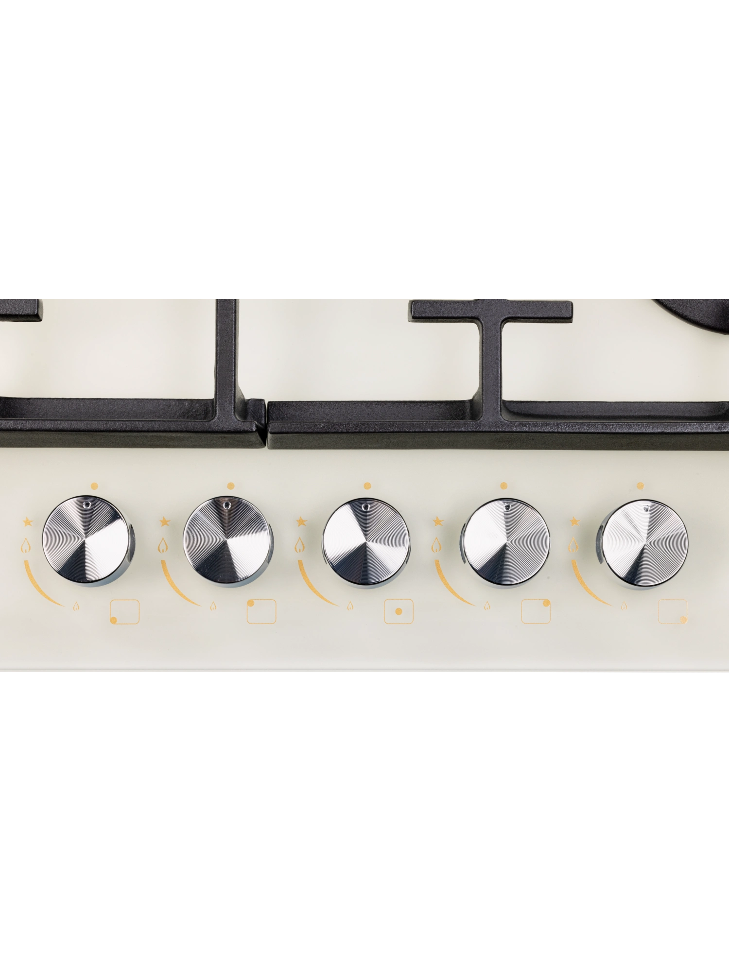 - Пять конфорок газовой варочной панели отличаются диаметром и мощностью. Дополнительная горелка позволяет готовить еще больше блюд одновременно. Самая большая конфорка – WOK с тройным рядом пламени и мощностью 3,4 кВт. Усиленный жар способен быстро нагреть толстостенную глубокую посуду с небольшим диаметром дна для приготовления азиатской кухни. Также на ней можно быстро вскипятить воду, ускорить процесс жарки мясных и рыбных блюд до хрустящей корочки при добавлении небольшого количества жира.