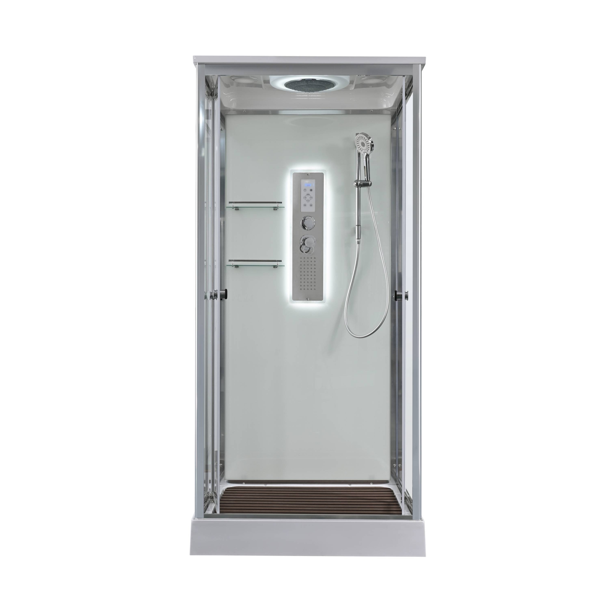 Стильная душевая кабина AvaCan сочетает в себе высокую функциональность, практичность и надежность. При изготовлении применяется безопасное закаленное стекло, надежно фиксируемое алюминиевым профилем.Профиль сделан из алюминия повышенной прочности. Сборка без силикона (увеличивает срок службы, защищает от протечек), внутренняя сборка (облегчает установку и ревизию; позволяет установить в ограниченном пространстве и обойтись без демонтажа других сантехнических приборов), смеситель резьбовой (без хомутов).Двойные металлические ролики дверей (распределение нагрузки на два ролика, увеличивают срок службы). Душевая штанга(позволяет регулировать по высоте ручную лейку), ручная арома-лейка с витамином С (картридж в комплекте,есть возможность замены или удаления картриджа), полочки(из стекла, с ограничителем), сифон с гидрозатвором, сенсорный пульт управления с функциями: блютуз, LED подсветка, радио, вытяжка, гидромассаж спины, тропический (верхний) душ.