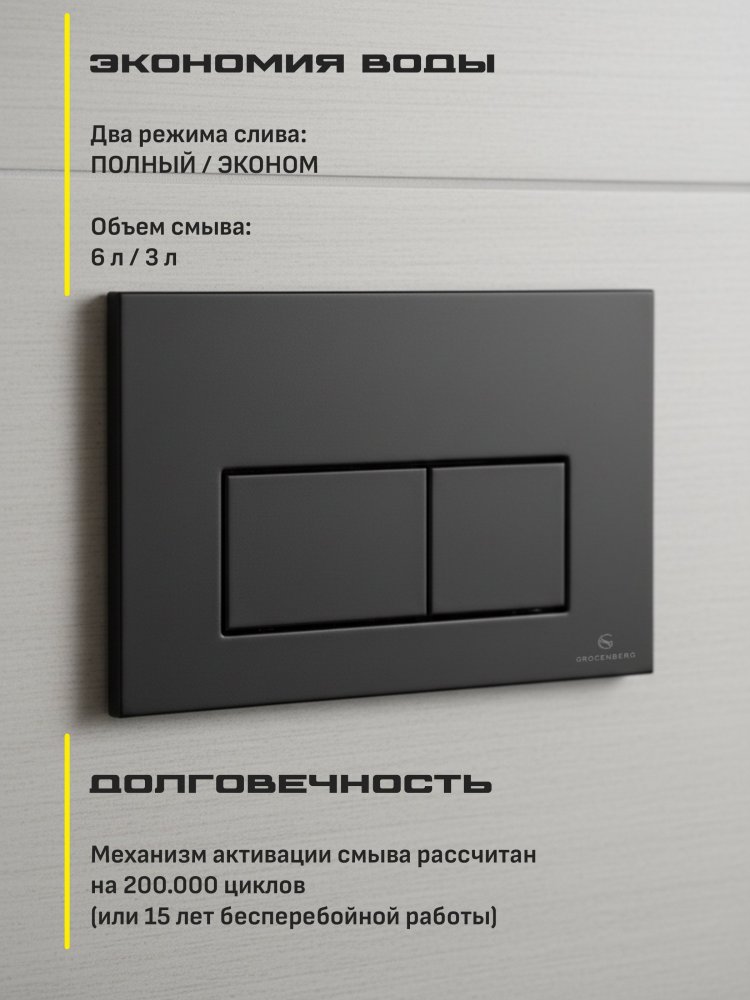- Благодаря продуманной конструкции и эргономичной кнопке для смыва, инсталляция Grocenberg обеспечивает максимальный комфорт при использовании. Плавный и мощный смыв позволяет забыть о любых неудобствах.