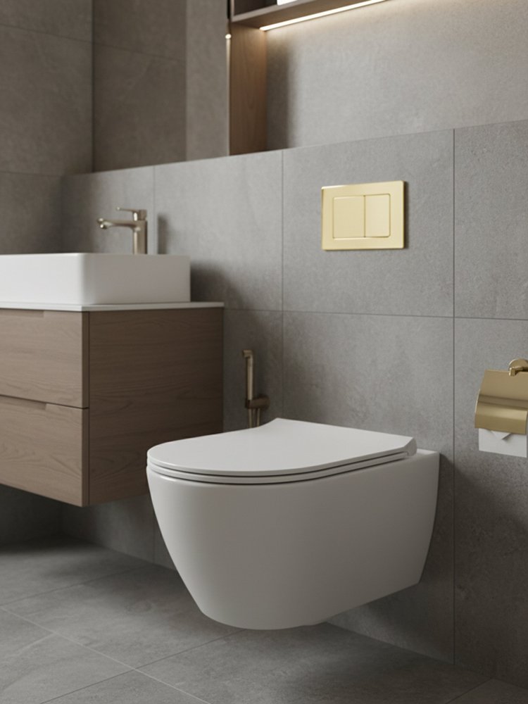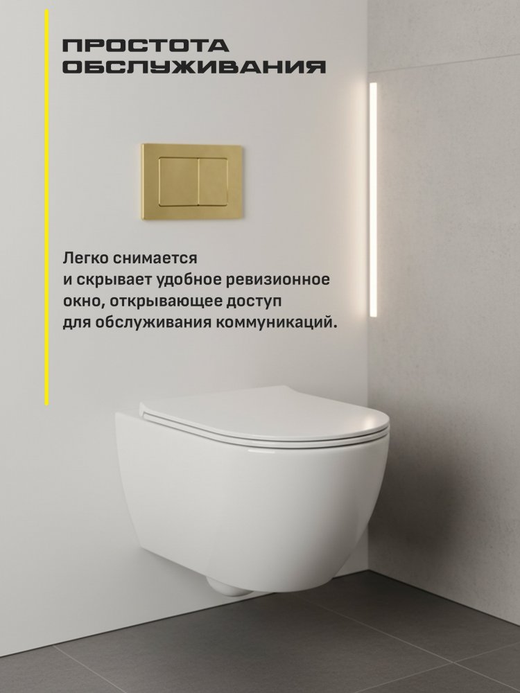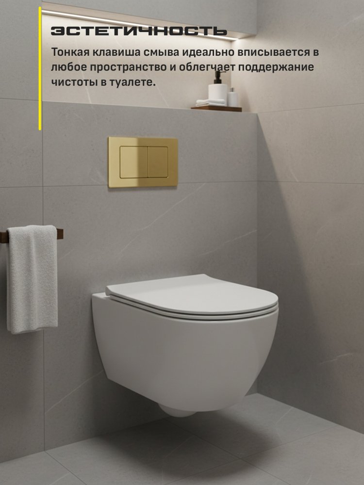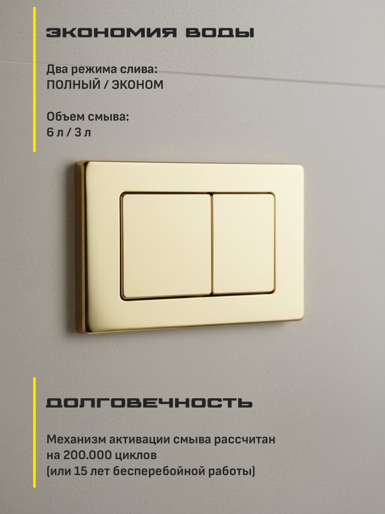 - Золотистый цвет инсталляции станет ярким акцентом в вашей ванной комнате, придавая ей роскошный и элегантный вид. Кнопка для смыва выполнена с особым вниманием к деталям, обеспечивая лёгкость и удобство использования.