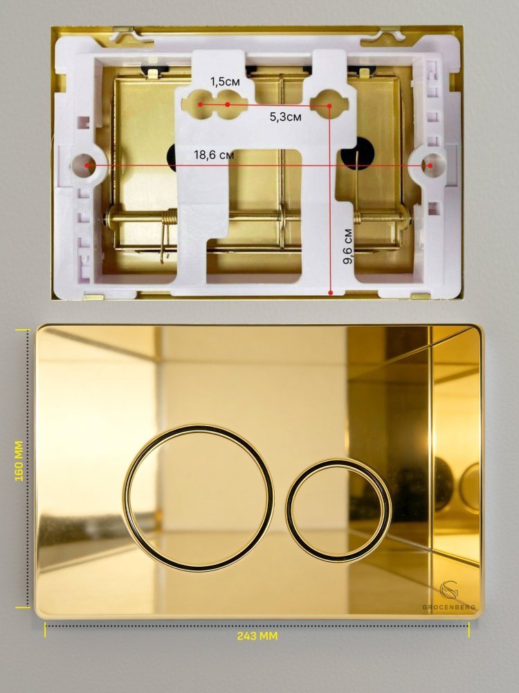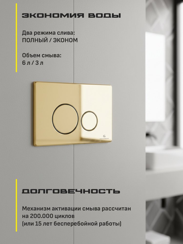 - Grocenberg GS3050-KM3090GO — это не только красота, но и функциональность. Плавный и надёжный механизм кнопки для смыва обеспечивает комфортное использование, а качественная конструкция гарантирует долговечность.