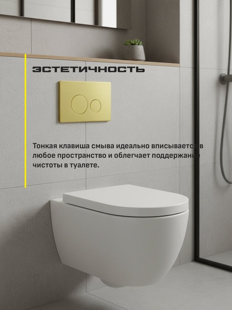 - Матовое золото придаёт инсталляции роскошный и утончённый вид, добавляя изысканности и шарма в ваш интерьер. Плавные линии и продуманный дизайн делают эту модель не только красивой, но и функциональной. Кнопка для смыва обеспечивает лёгкость использования и комфорт.