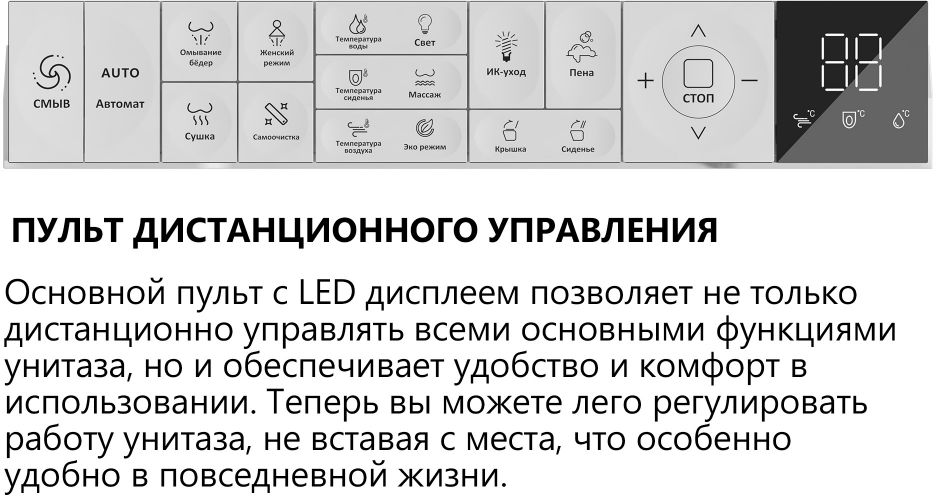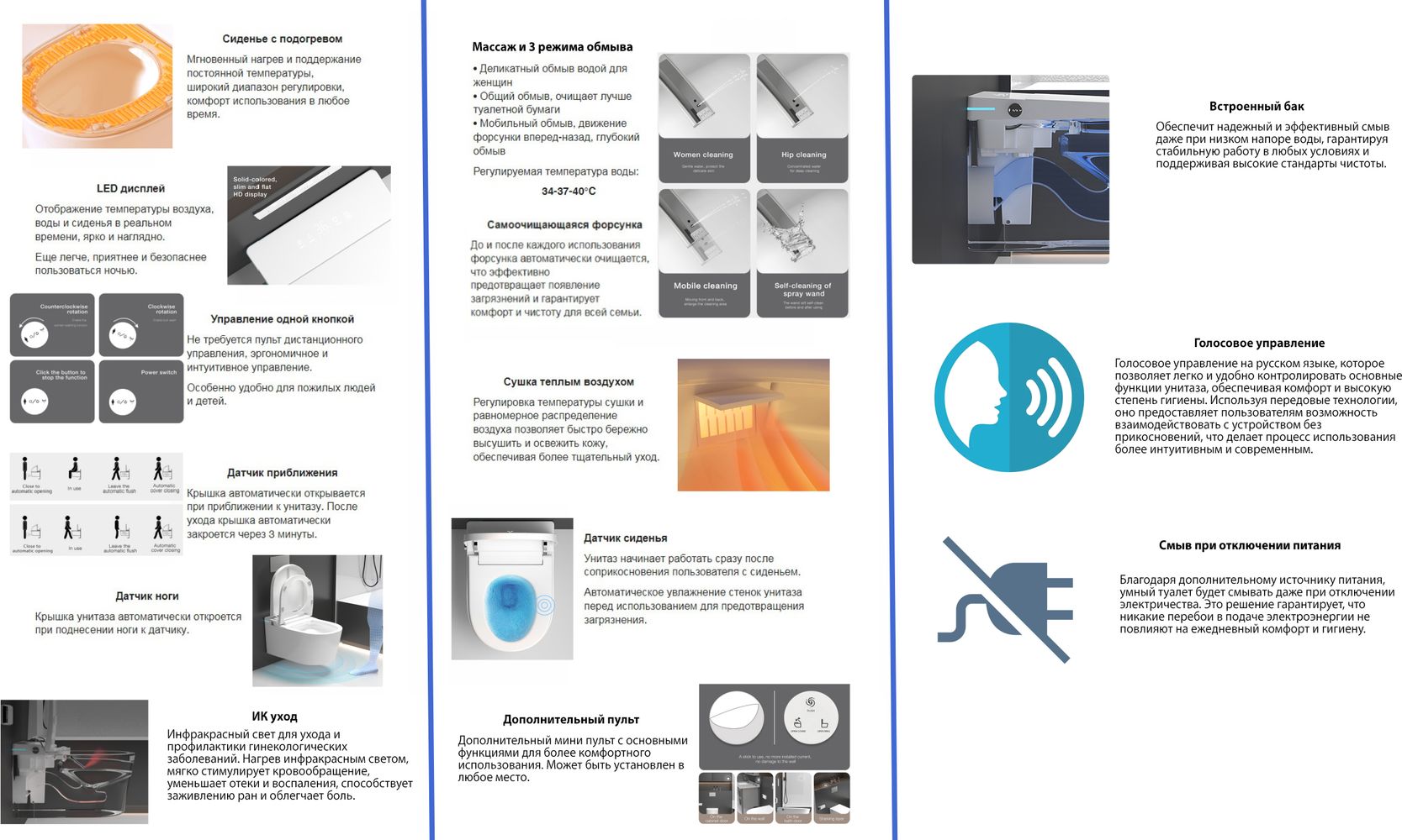 - Состоит из подвесного керамического электронного унитаза-биде с импульсным смывом, сиденья для унитаза из дюропласта с микролифтом, инсталляции для унитаза.