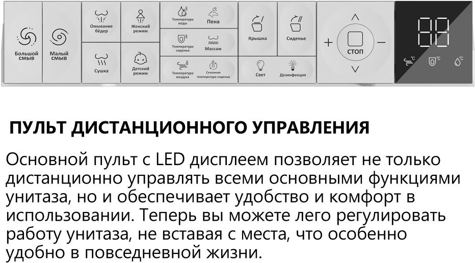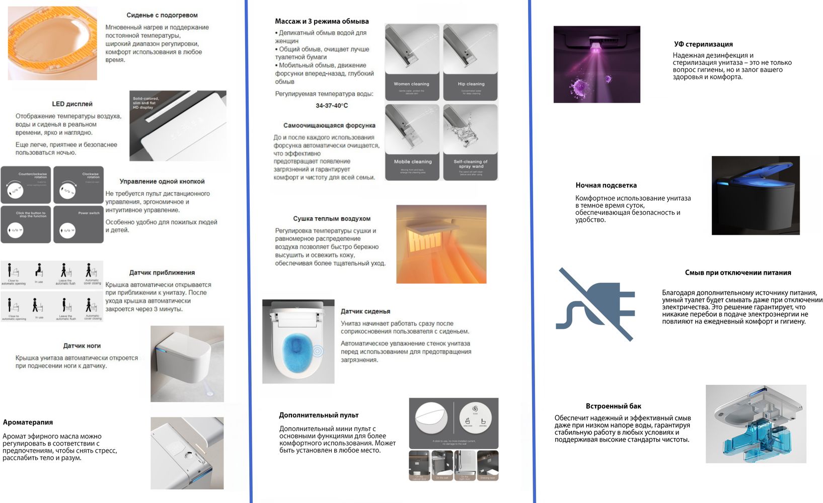 - Состоит из подвесного керамического электронного унитаза-биде с импульсным смывом, сиденья для унитаза из дюропласта с микролифтом, инсталляции для унитаза.