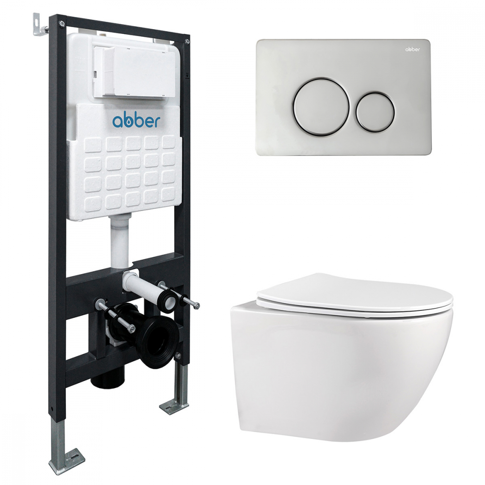 Инсталляция с подвесным унитазом комплект: Abber AC0105 с подвесным безободковым унитазом Bequem AC1100 с крышкой микролифт, кнопка смыва AC0121 хром.