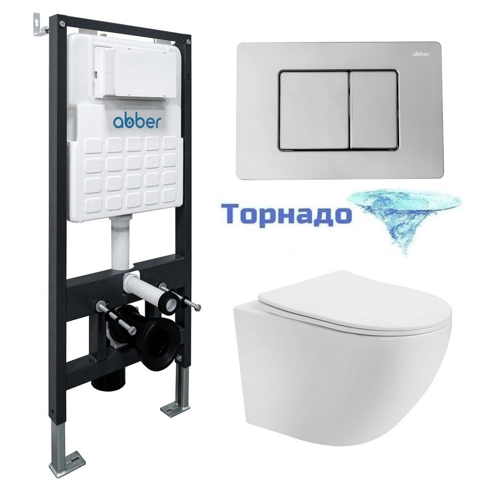 Инсталляция с подвесным унитазом комплект: Abber AC0105 с подвесным унитазом Bequem AC1100T с крышкой микролифт, кнопка смыва AC0120 хром (система смыва Торнадо)