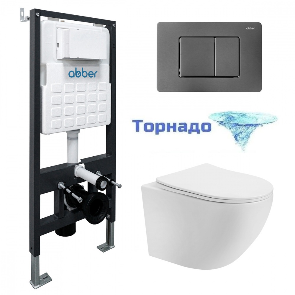 Инсталляция с подвесным унитазом комплект: Abber AC0105 с подвесным унитазом Bequem AC1100T с крышкой микролифт, кнопка смыва AC0120NG никель (система смыва Торнадо)