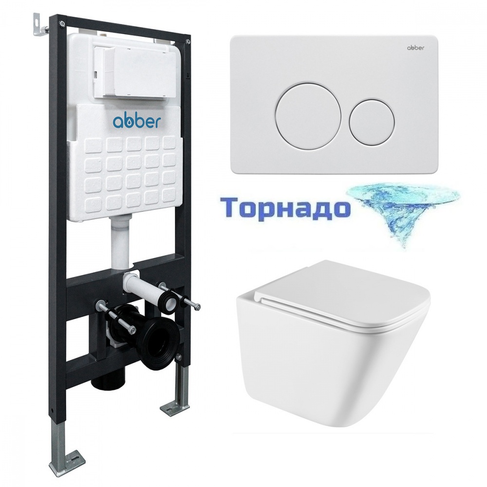 Инсталляция с подвесным унитазом комплект: Abber AC0105 с подвесным унитазом Rechteck AC1219TC с крышкой микролифт, кнопка смыва AC0121MW белая матовая (система смыва Торнадо)