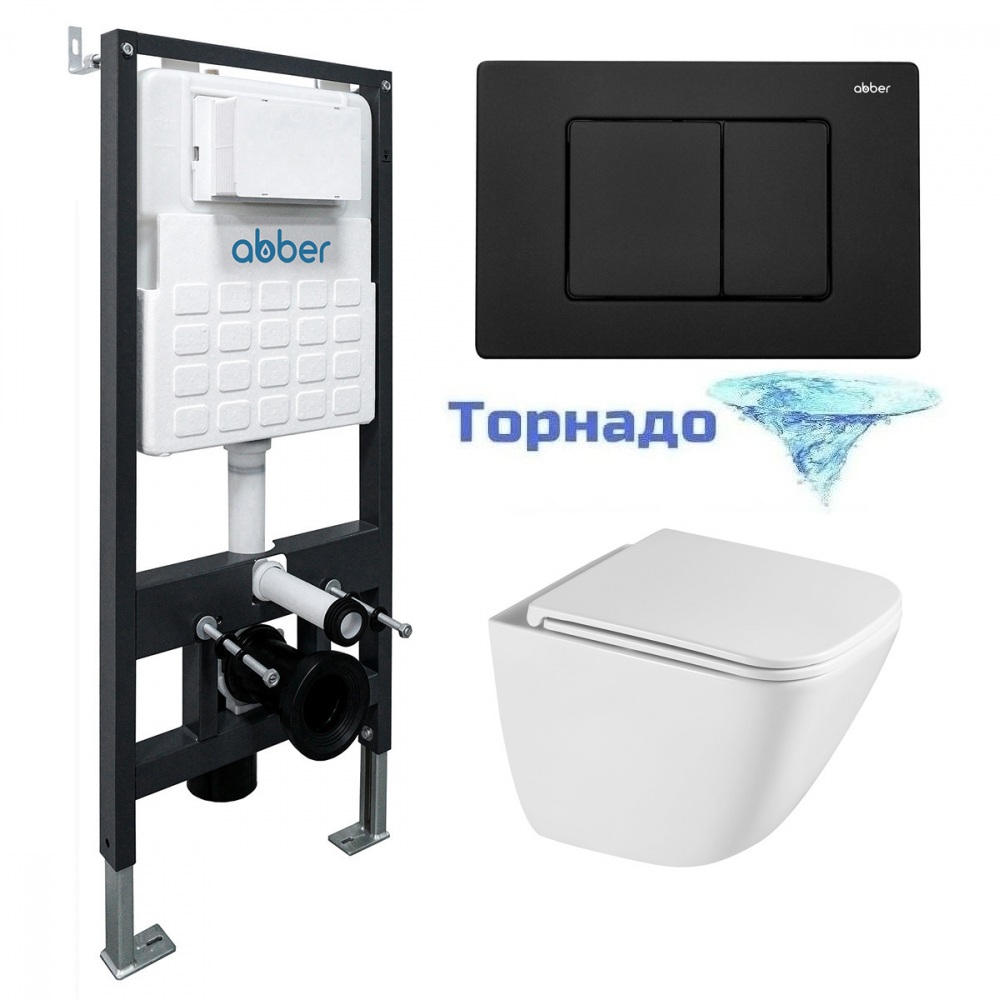 Инсталляция с подвесным унитазом комплект: Abber AC0105 с подвесным унитазом Rechteck AC1220TC с крышкой микролифт, кнопка смыва AC0120MB чёрный матовый (система смыва Торнадо)