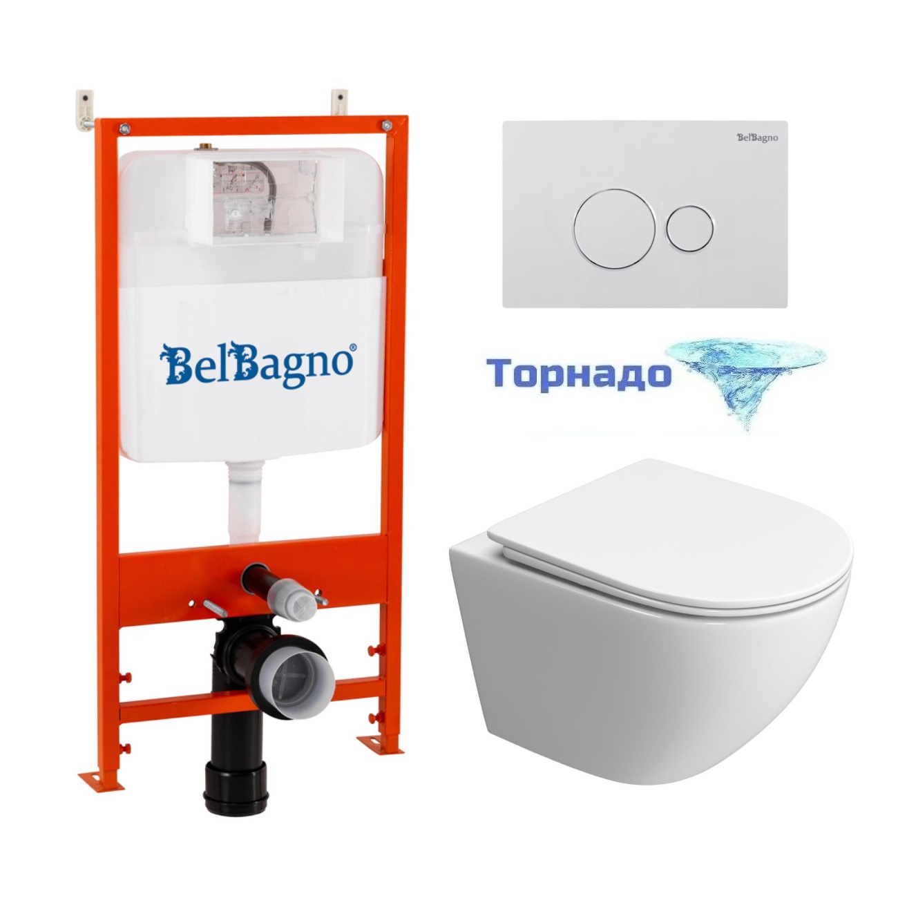 Инсталляция с подвесным унитазом комплект: BelBagno Uno BB5177CH-TOR/SC/BB026/BB082BL с подвесным безободковым унитазом, сиденье микролифт, крепление, кнопка смыва белая (система смыва торнадо)