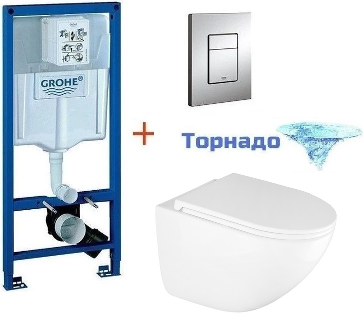 Инсталляция с подвесным унитазом комплект: Grohe Rapid SL 38772001 с подвесным безободковым унитазом Azario Trevi AZ-0093UQ3 TORNADO сиденье микролифт, крепление, кнопка смыва хром