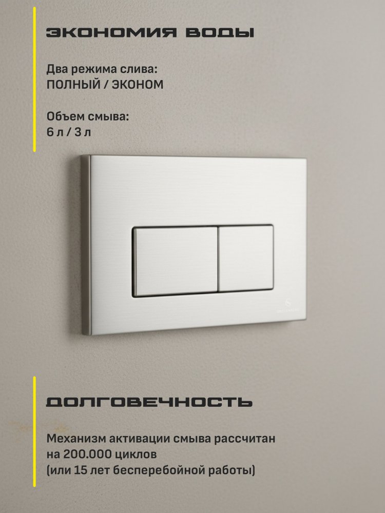 - Эта кнопка смыва отличается элегантным дизайном и плавным ходом, что делает её не только функциональной, но и приятной на ощупь. Она легко впишется в любой интерьер и станет его гармоничной частью.