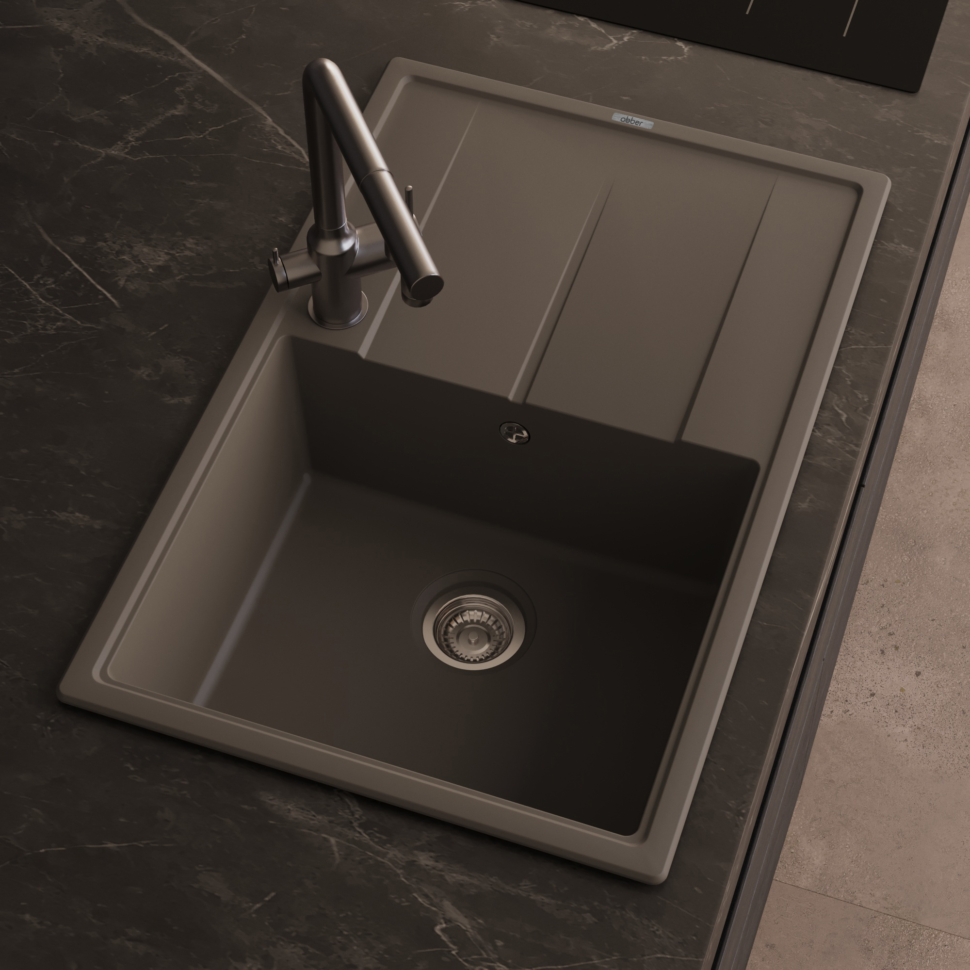 Кухонная мойка Abber Quarz AQ2904G со слив-переливом и корзинчатым вентилем, материал кварцевый композит. Цвет серый.