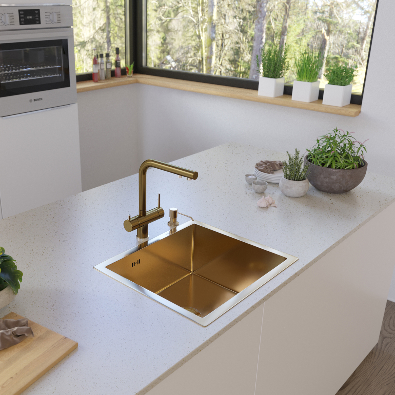 Кухонная мойка Gerhans K35043G - модель в цвете золото. Изготовлена из нержавеющей стали, толщиной - 3 мм. Возможен монтаж мойки поверх столешницы, в один уровень со столешницей и под столешницу. Поверхность - полированная. Модель комплектуется сифоном.