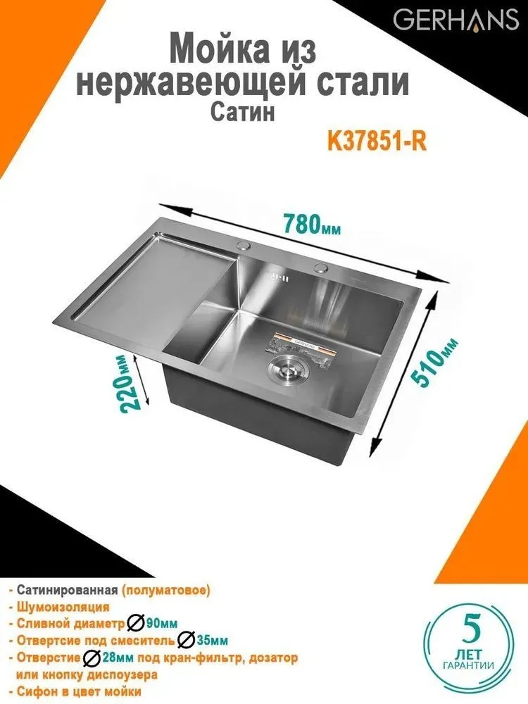 Кухонная мойка Gerhans K37851-R 1 мм, нержавеющая сталь R
