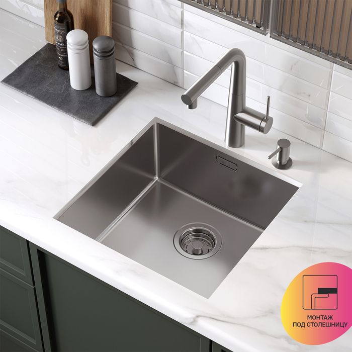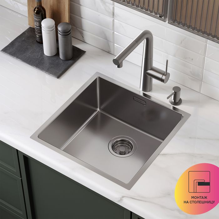 - Универсальный монтаж на ваш выбор: установка сверху на столешницу (вырез под мойку составляет 416х416хR20 мм), подстольным (вырез под мойку составляет 405х405хR12,5 мм) и интегрированным вровень со столешницей способом.