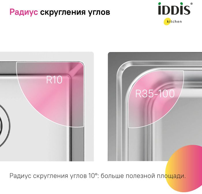 - Малый радиус скругления углов 10 мм – для строгой геометрии мойки и ее большой вместительности. Подойдет для кухни-гостиной: специальное антишумовое покрытие и полимерные накладки на оборотной стороне чаши снижают шум при использовании. Подойдет для шкафа от 50 см.