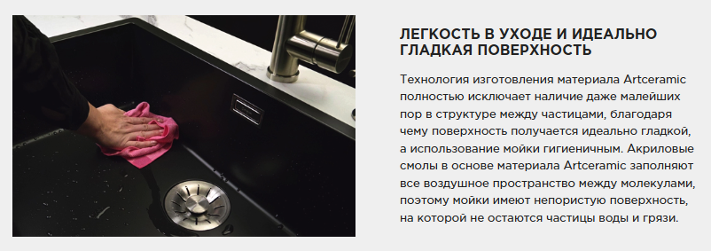 - Т.к в основе материала Artceramic содержится смесь акриловых смол, которые заполняют всё воздушное пространство между молекулами, мойки имеют непористую поверхность, благодаря чему частицы воды и грязи не остаются на поверхности;