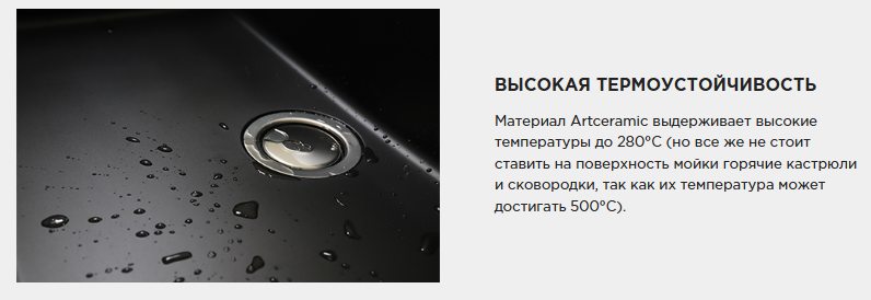 - Материал выдерживает высокие температуры до 280°С (но не стоит ставить на поверхность мойки горячие сковородки и кастрюли, т. к их температура может достигать 500°С);