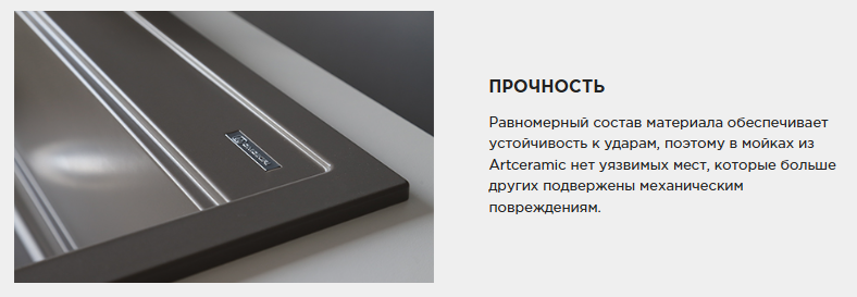 - Равномерный состав материала Artceramic обеспечивает устойчивость к ударам. В мойках из данного материала нет уязвимых мест, которые больше других подвержены механическим повреждениям;