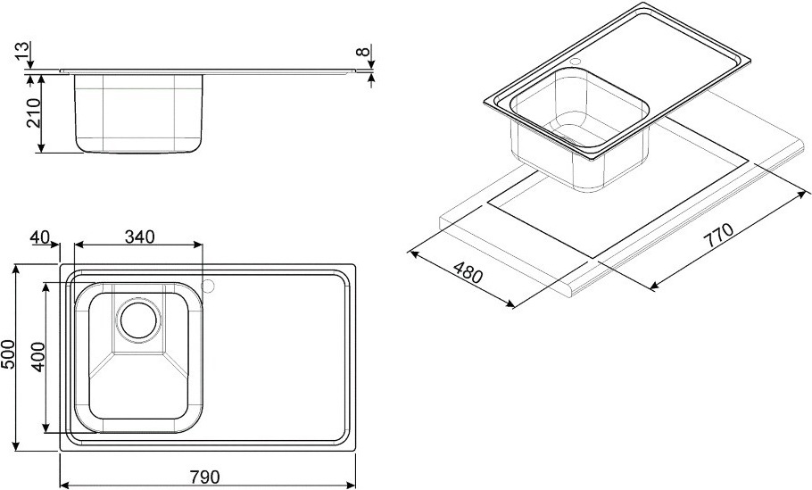 Пример: Внешний размер мойки - 800х500 мм. Размер отверстия под данную мойку 780х480 мм.