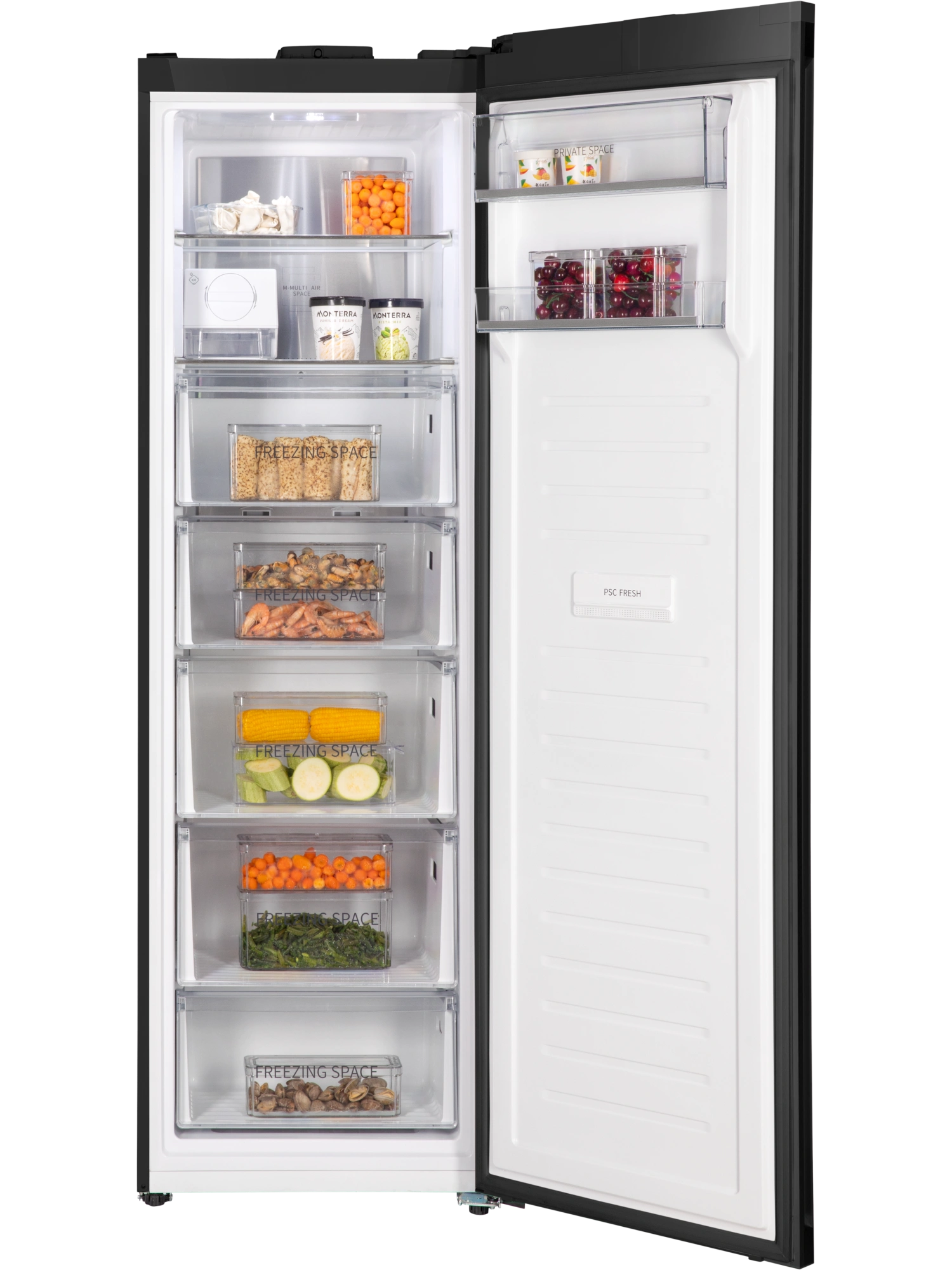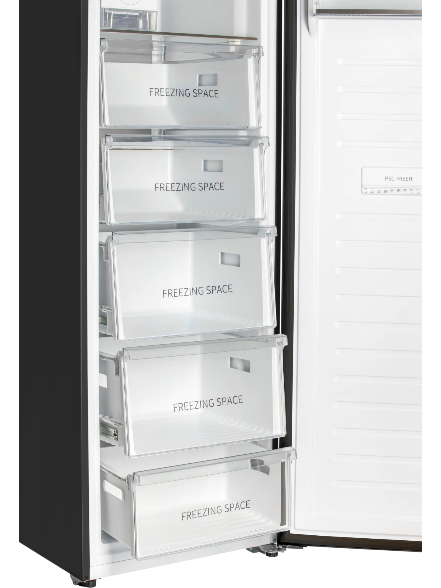 - Функция FRESH SPACE реализуется за счёт того, что на внутренней стороне двери морозильника находится блок PSC FRESH, обогащённый свободными ионами наносеребра. Он уничтожает вредные бактерии, помогает устранять запахи и надолго сохранять свежесть продуктов.