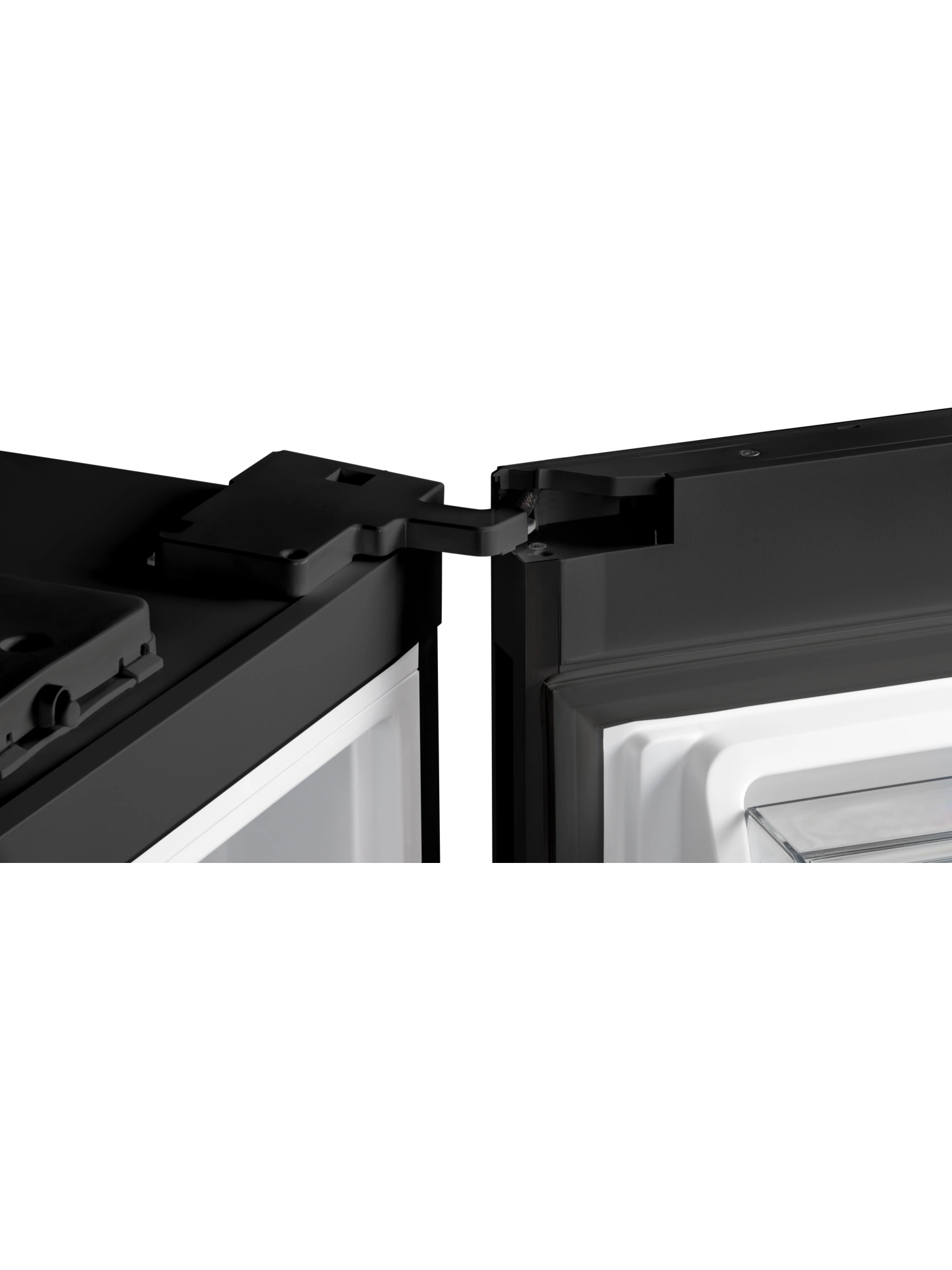 - Дверь морозильника имеет уникальный дизайн, выполнена из закаленного чёрного стекла. Дверь можно перенавесить с правой стороны на левую. Для легкого открывания в модели предусмотрена функция автооткрытия стуком — необходимо постучать по верхней части поверхности более двух раз, и дверь морозильника приоткроется.