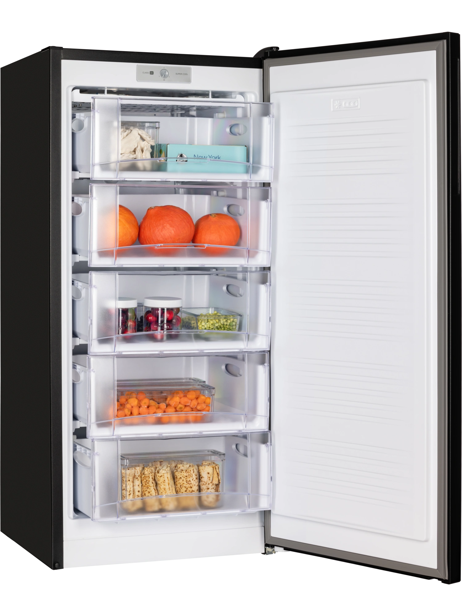 - Морозильник имеет 5 выдвижных прозрачных ящиков и форму для льда. Внутренняя поверхность модели имеет антибактериальное покрытие, которое предотвращает появление неприятных запахов и образование бактерий.