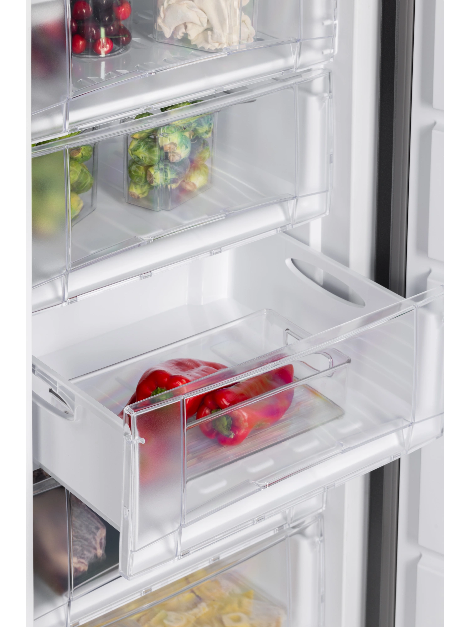 - Морозильник имеет 5 выдвижных прозрачных ящиков и 1 отделение с откидной шторкой для размещения продуктов, а также форму для льда. Внутренняя поверхность модели имеет антибактериальное покрытие, которое предотвращает появление неприятных запахов и образование бактерий.