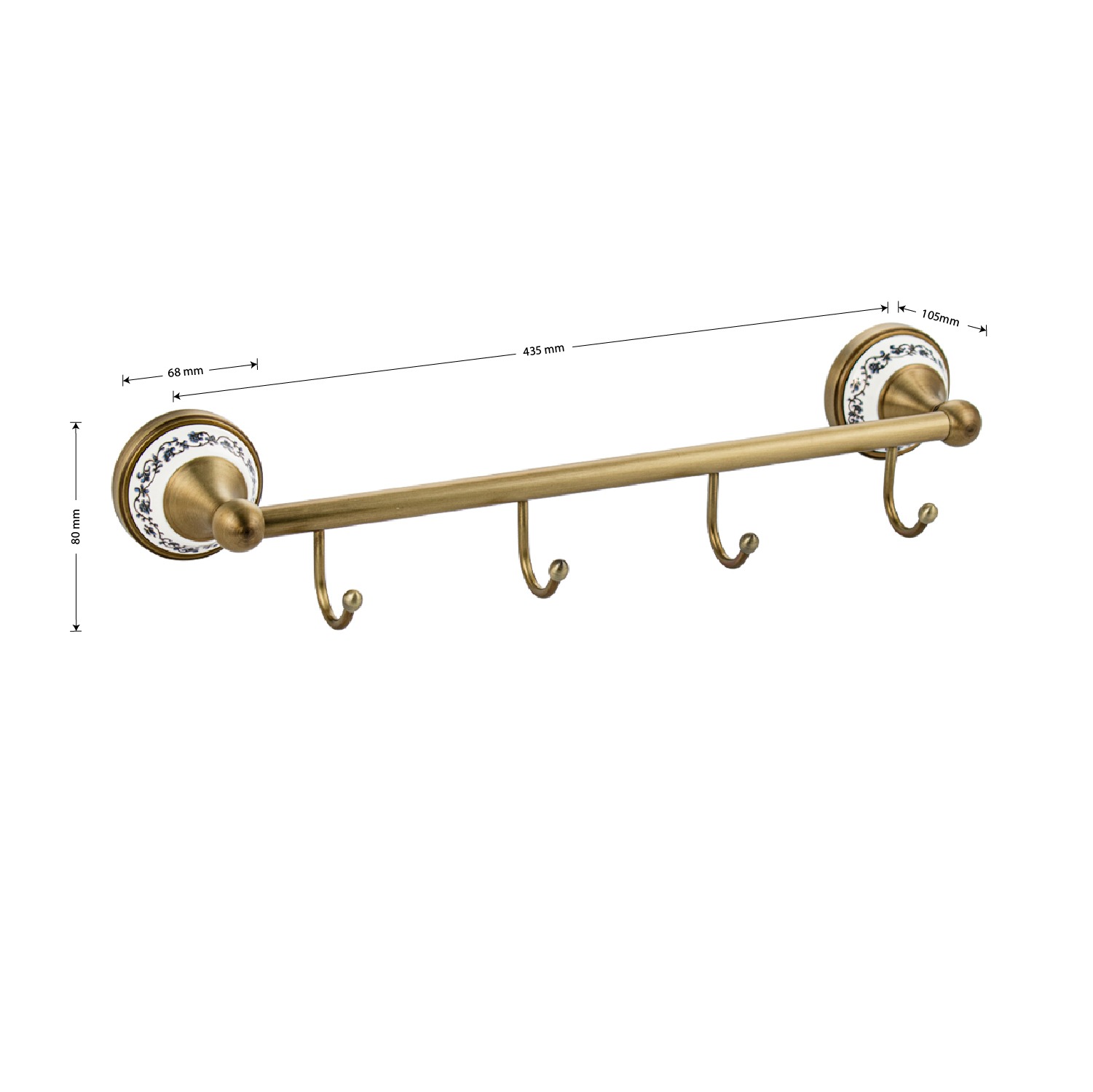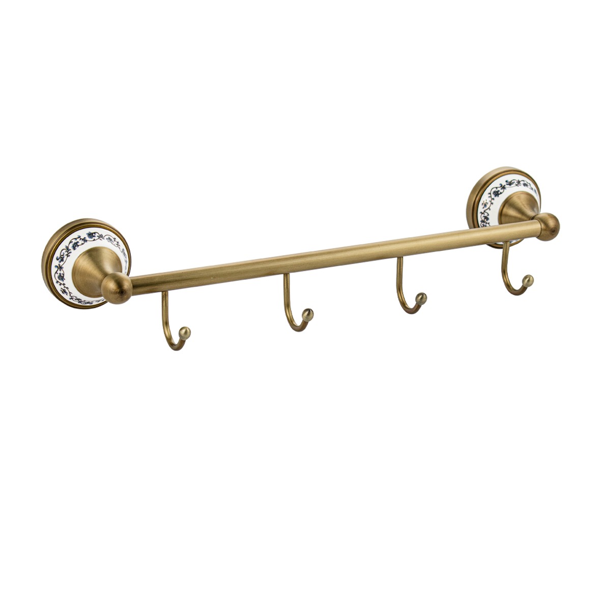Держатель для полотенец металлический, с четырьмя крючками,с керамической вставкой с орнаментом. Материал изготовления — ЦАМ. Бронзовое, матовое покрытие очень стойко переносит истирания и обеспечивает безупречный стильный вид изделия и долговечность. На держателе с легкостью можно размещать вещи для сушки или вешать, как полотенца, так и одежду перед походом в душ. Идеально подойдет не только для ванной, но и для кухни, а также для дачи или гаража - при необходимости на держатель можно вешать любые предметы. Изделие крепится к стене с помощью дюбелей и саморезов (входят в комплект). Габаритные размеры: длина 435 мм, высота 80 мм, глубина 105 мм, основание 68 мм. Вес - 0,74 кг, объём - 0,005 м3
