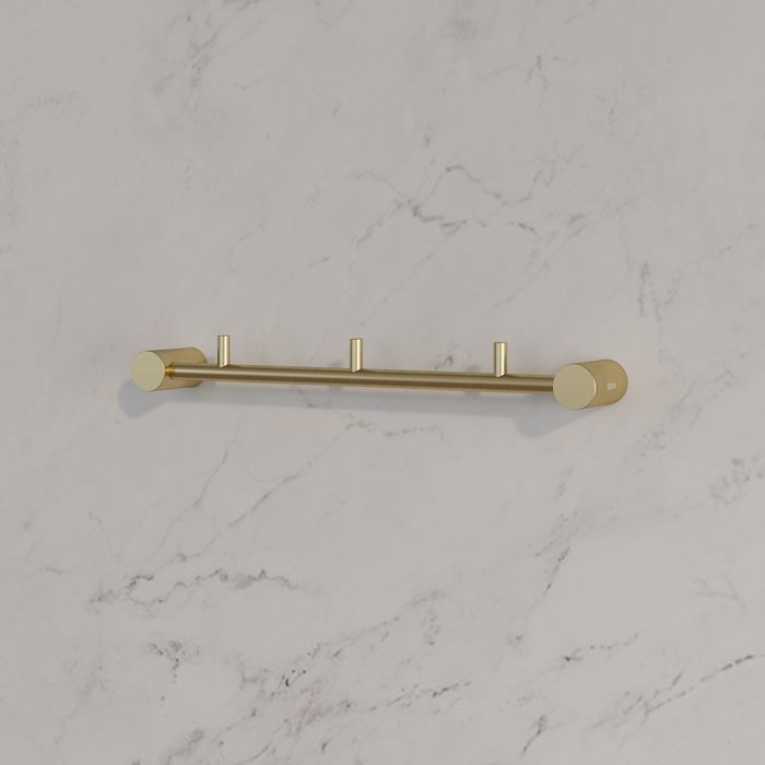 - Планка с тремя крючками Petite в матовом золотом цвете позволит с комфортом разместить несколько банных полотенец и халатов, дополнив места для хранения в ванной.