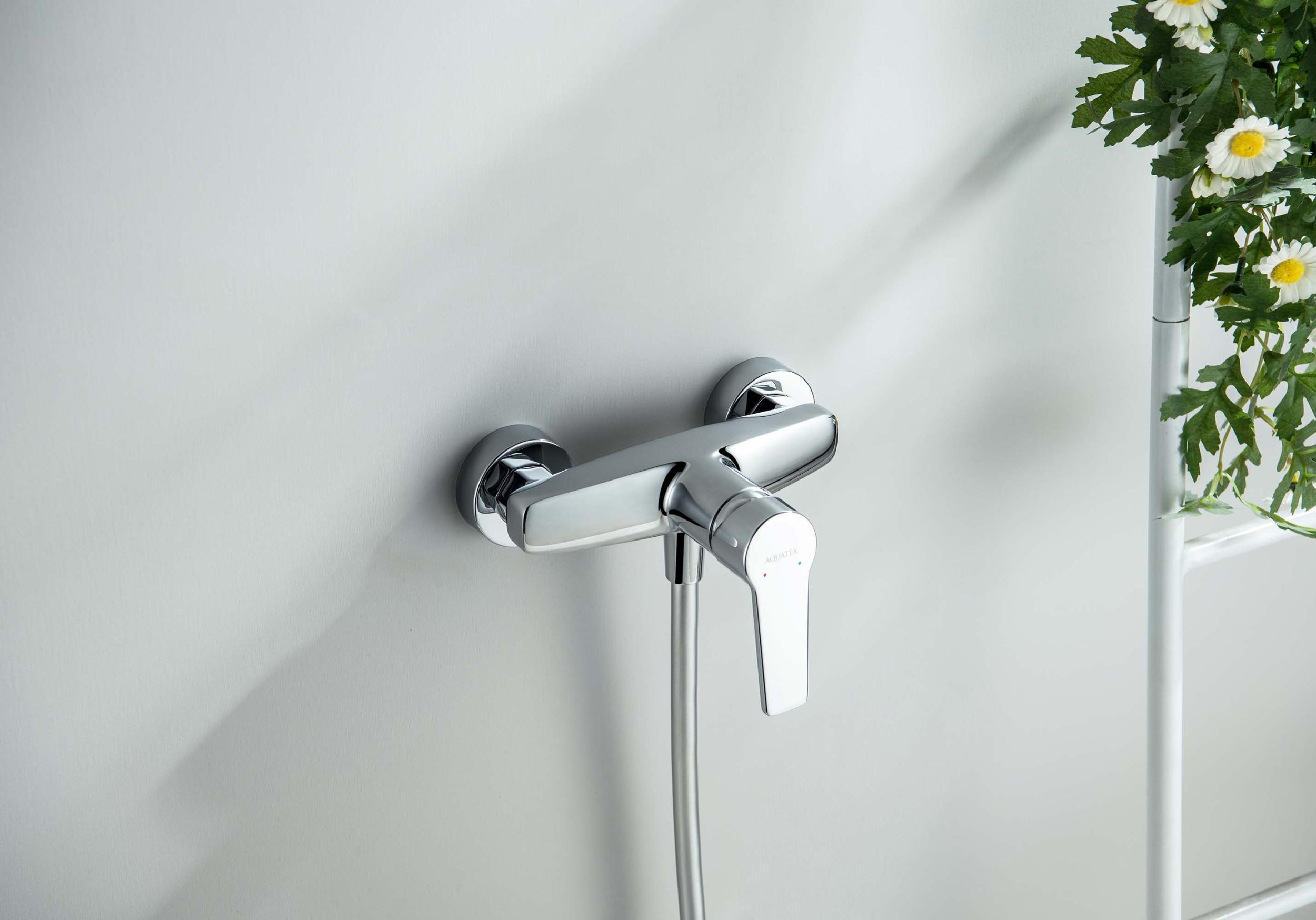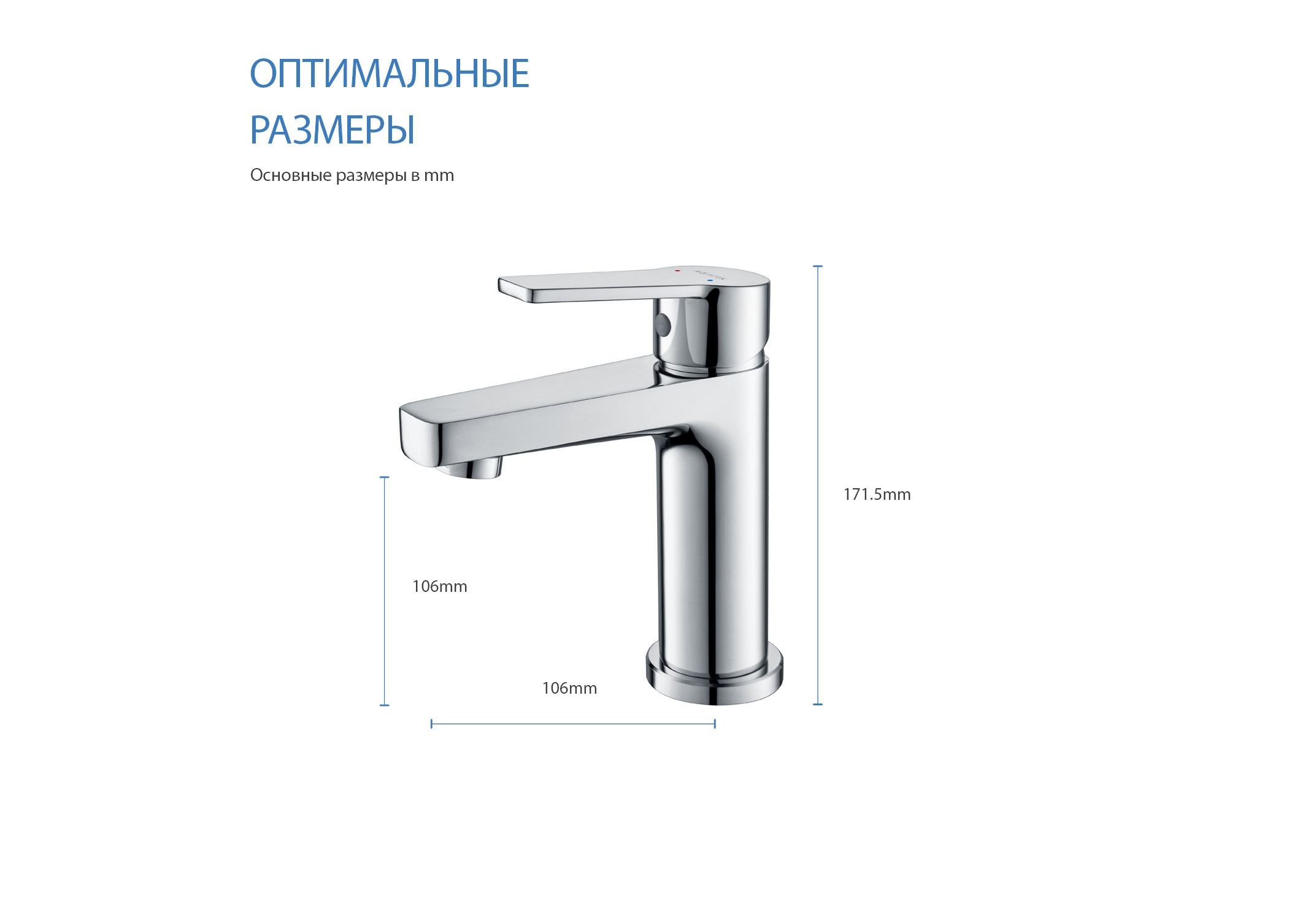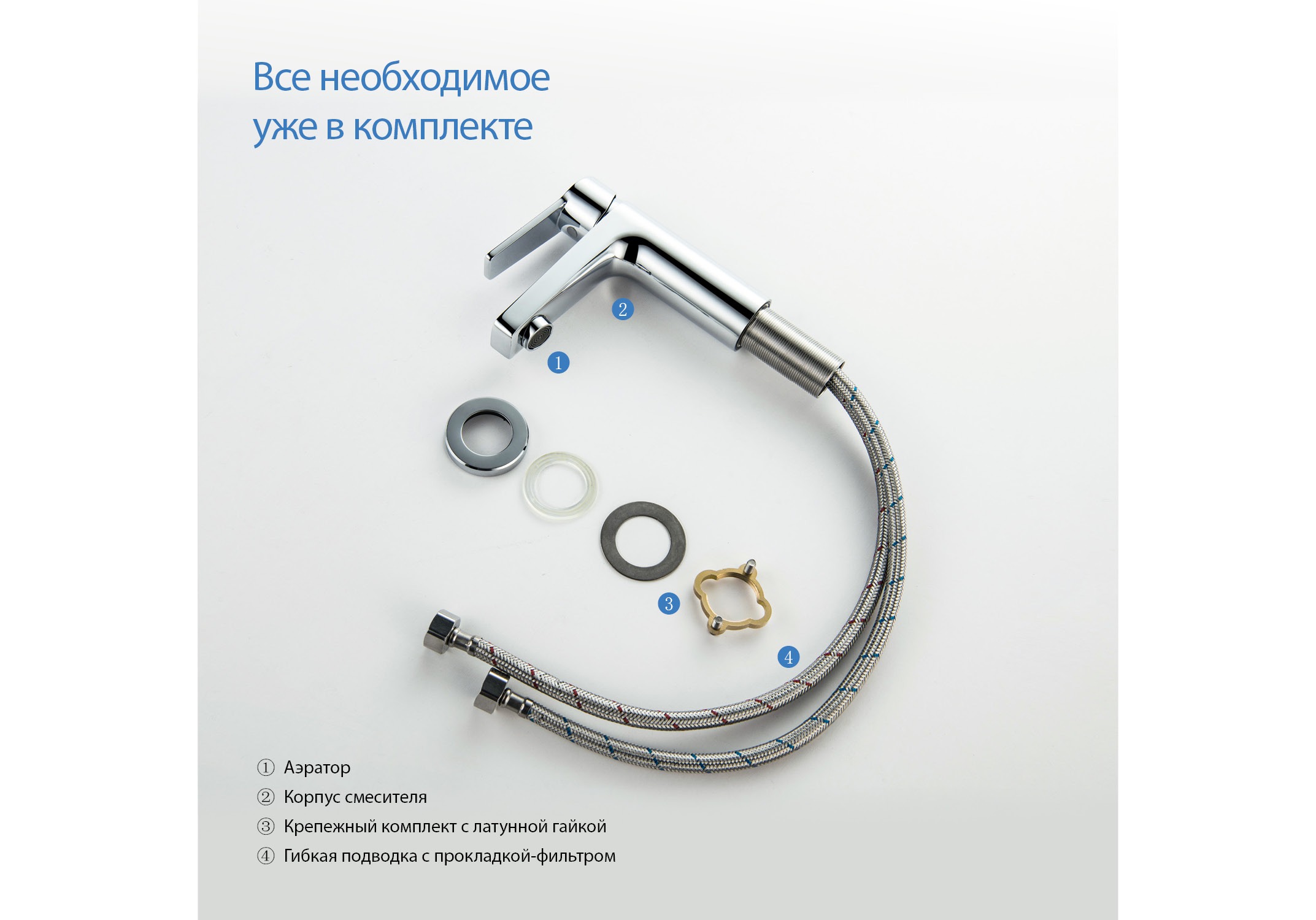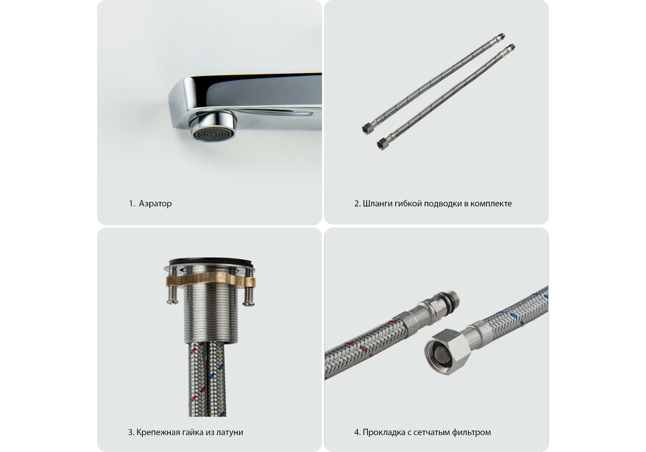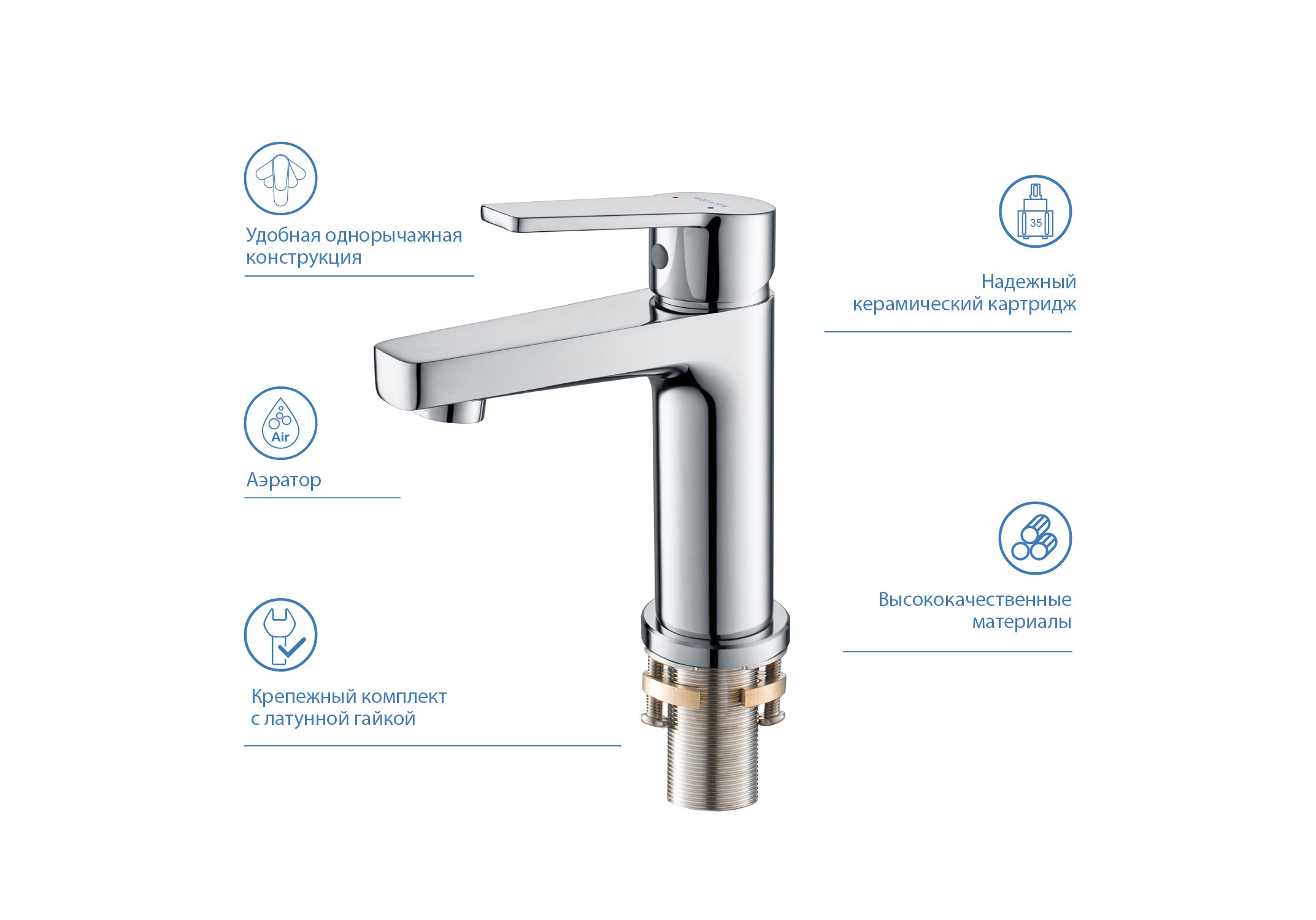 - Особенности: однорычажная система регулировки силы струи и температуры воды; цельный корпус смесителя снижает вероятность протечек; легкая очистка аэратора; оптимальная длина подводки